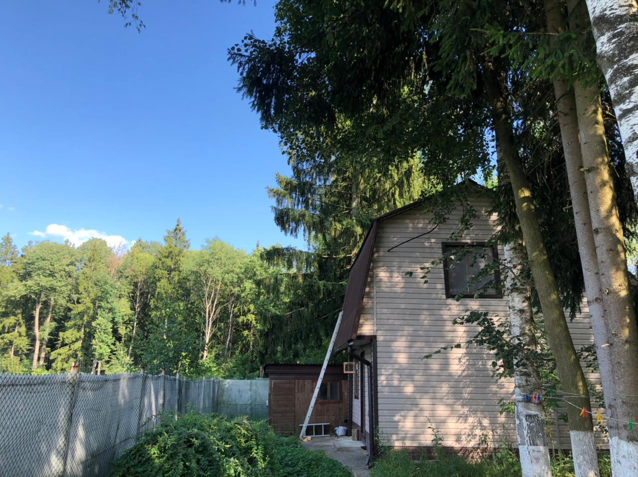 Дом 160 кв метров, стены брус, с внешней стороны сайдинг, 2 этажа, 6 комнат, 2 с/у. Есть баня 60 кв метров, 2 этажа, шикарно использовать как гостевой дом. И в доме, и в бане все коммуникации есть. На участке мангальная зона, великолепные берёзы, ели. В жару невероятно комфортно находиться в тени деревьев. Участок примыкает к лесу.