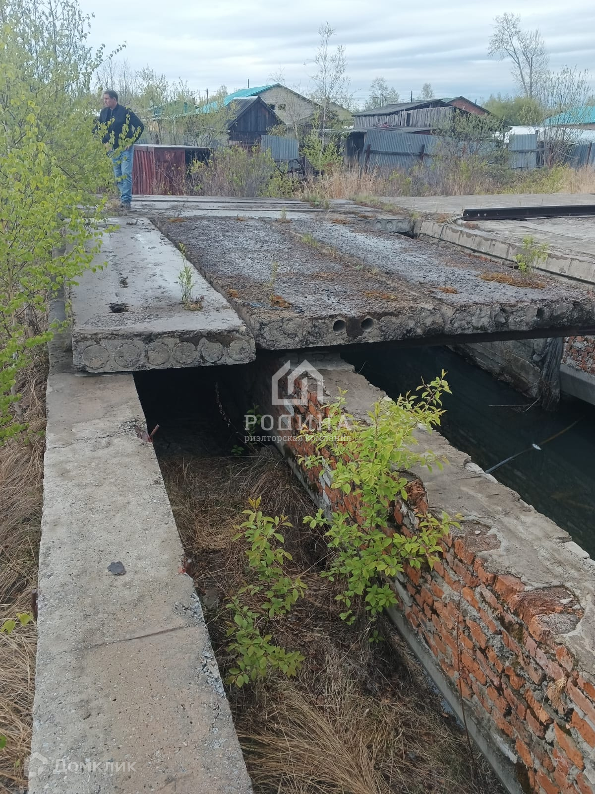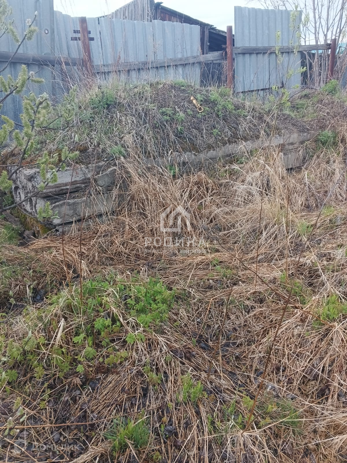 Участок огорожен металлическим забором , на территории залит фундамент под строительство дома.