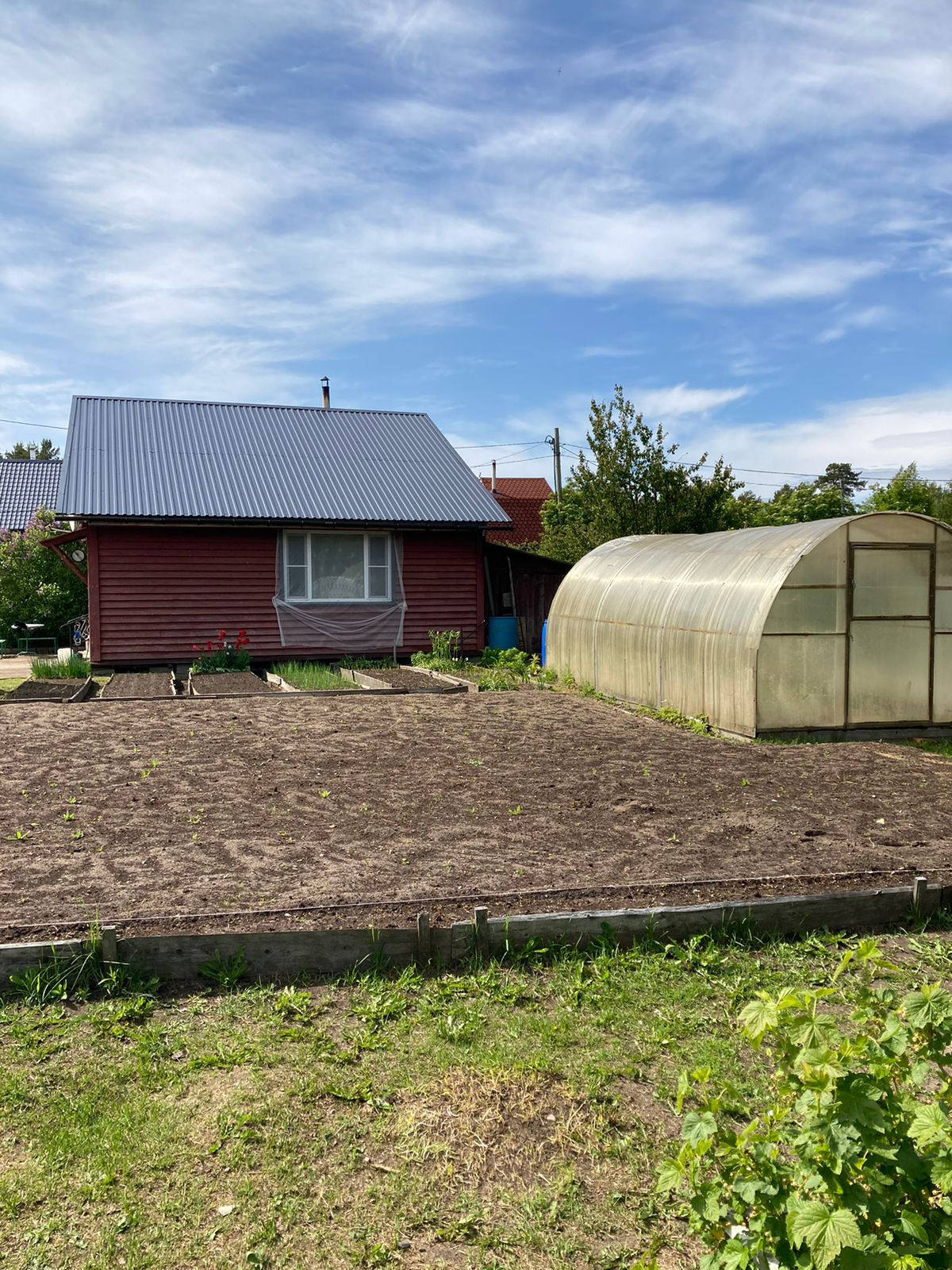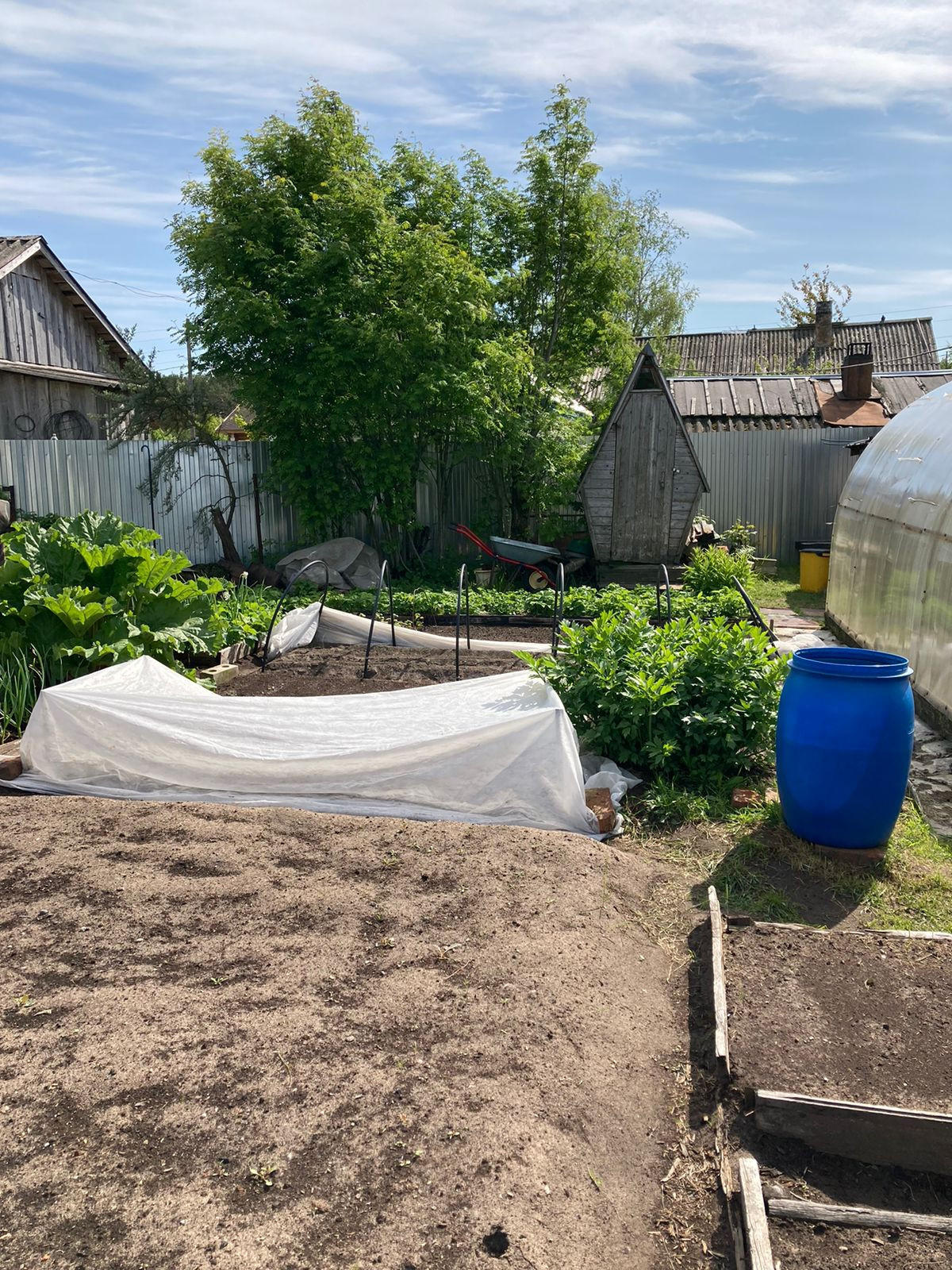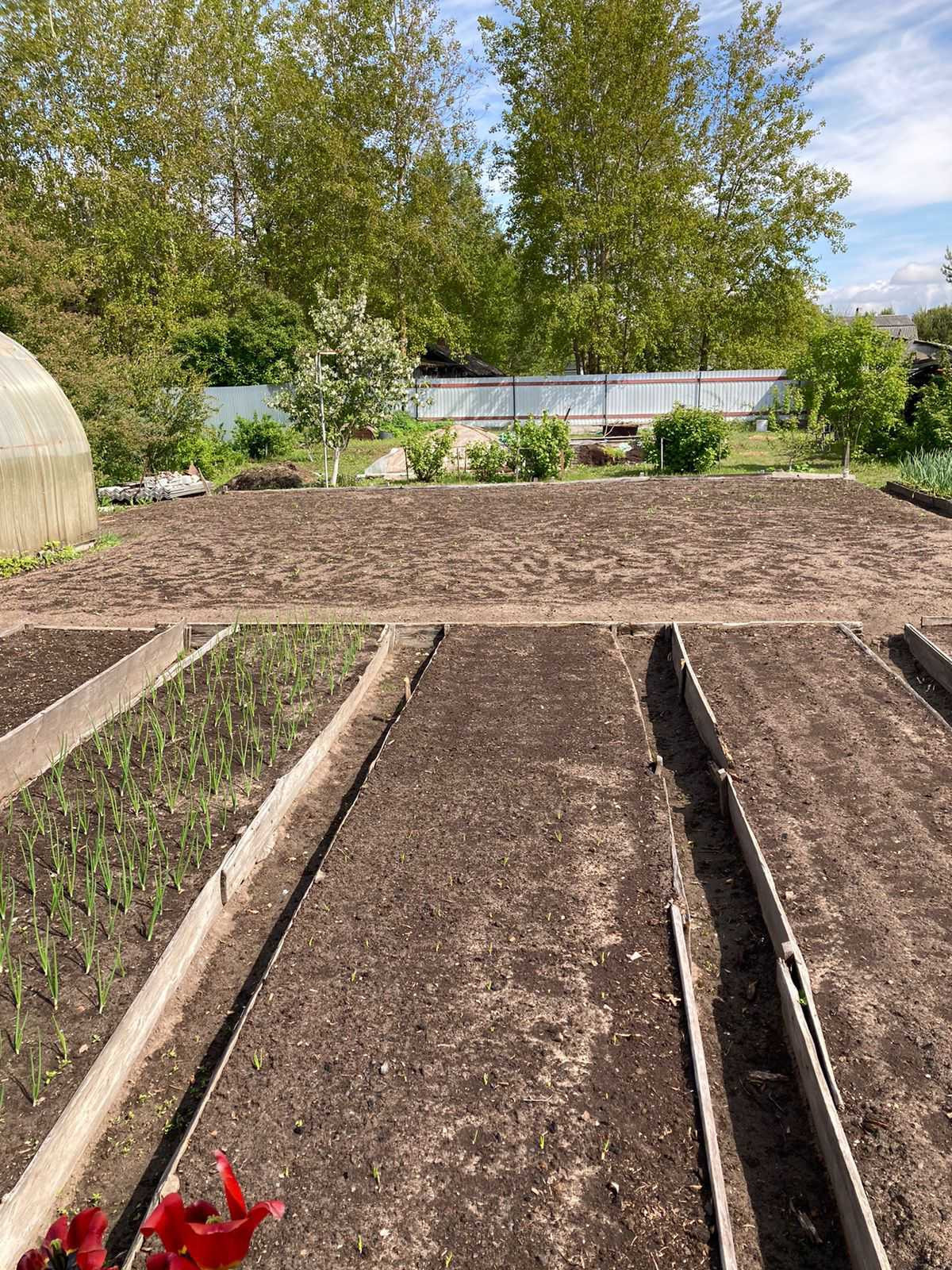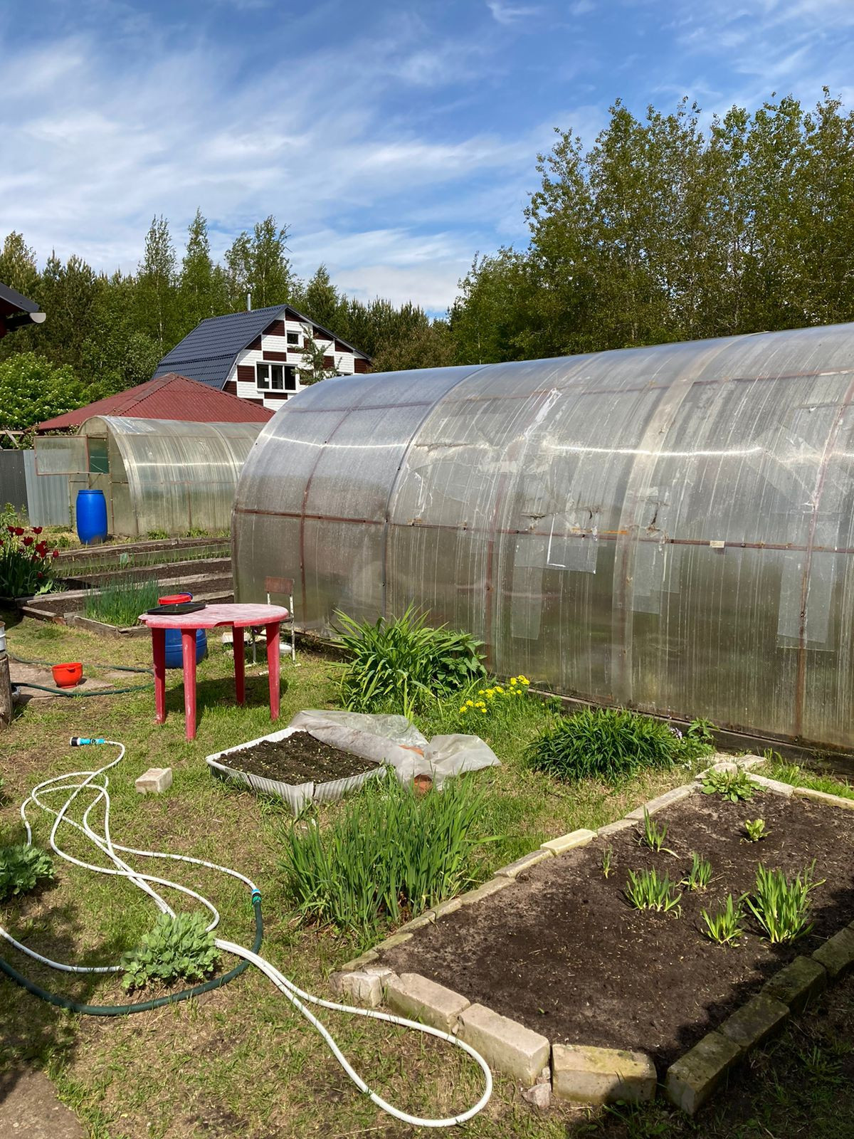 Ухоженный участок, парники, грядки, плодово-ягодные растения.