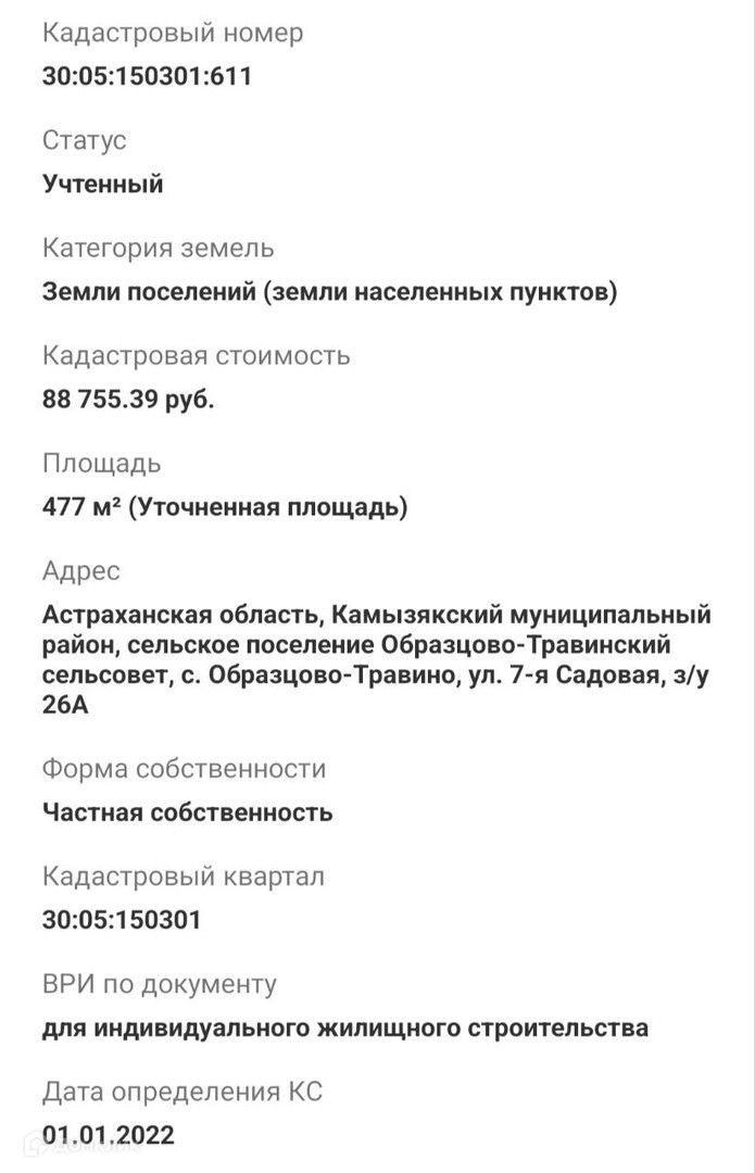 Продается земельный участок (ИЖС) отмежеван. Общей площадью 477 кв.м, расположенный на землях населенных пунктов под строительство жилых домов в Камызякском районе, с.Образцово-Травино, ул.7-я Садовая. В живописном районе вблизи реки Гандурино. Инвестиции в приобретении земельных участков это выгодное вложение со временем земли только дорожают.