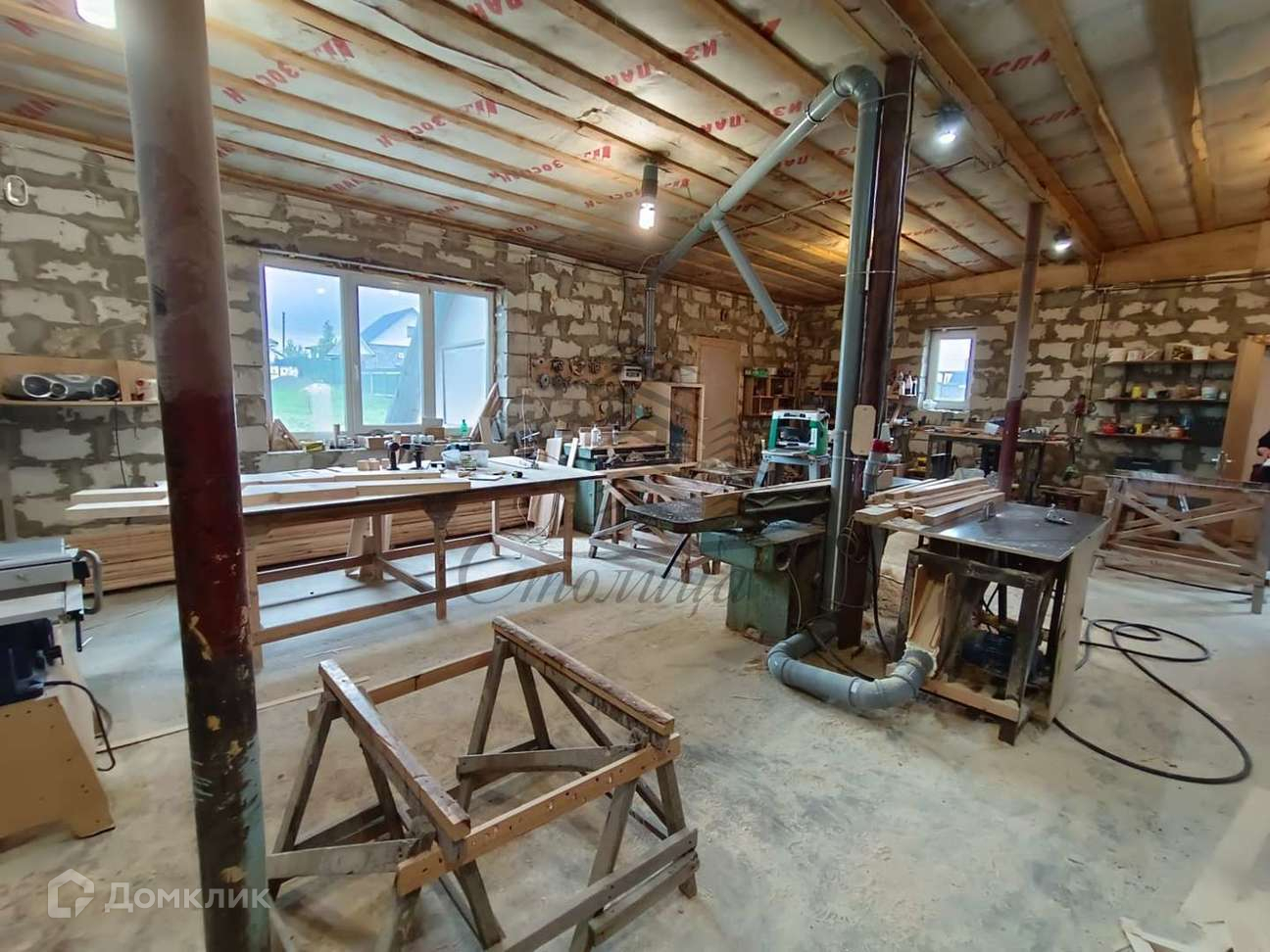 Второй дом вмещает в себя гараж со смотровой ямой и изолированную большую студийную комнату, которую можно оборудовать под полноценное жилое пространство (дом площадью 90 кв.м.) , или использовать как мастерскую (именно так это пространство сейчас используется собственниками).