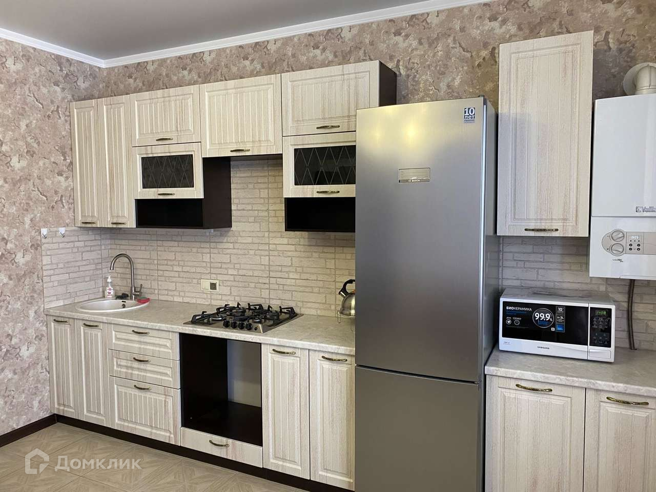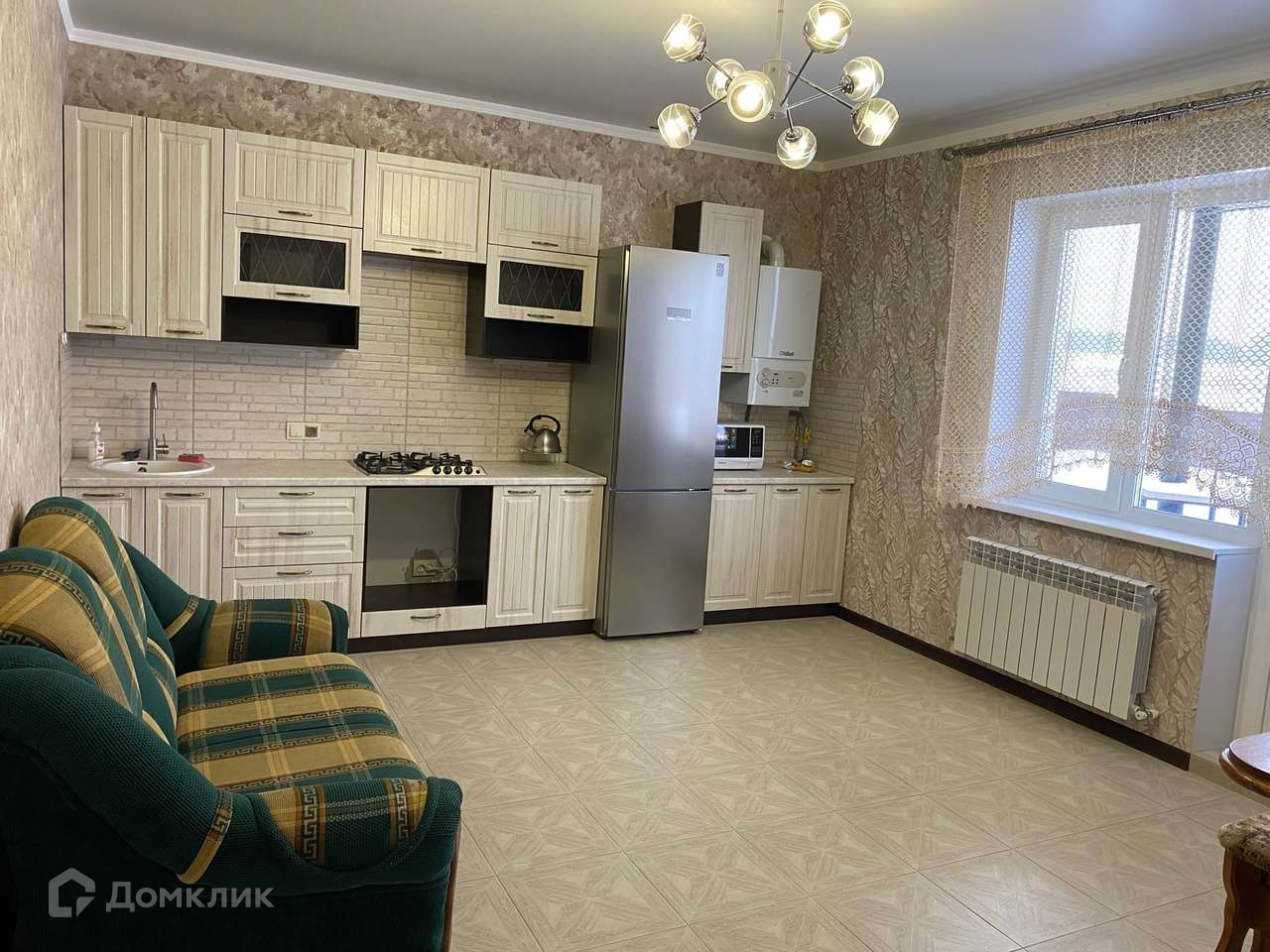 кухня: пол - плитка, натяжной потолок;