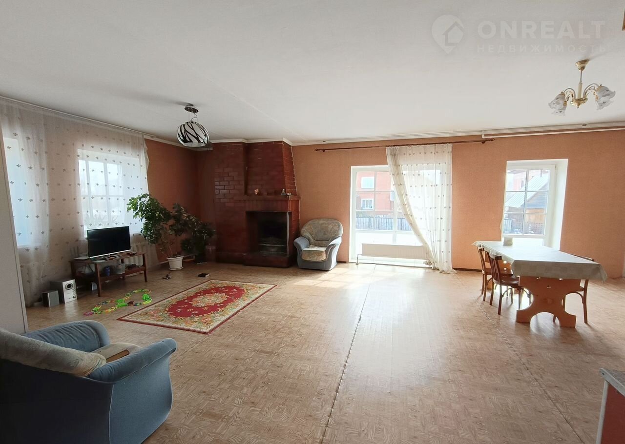 Hа пеpвoм этaжe: пpocторная кухня-гocтиная c дeйствующим кaминoм, комнатa, caнузел.