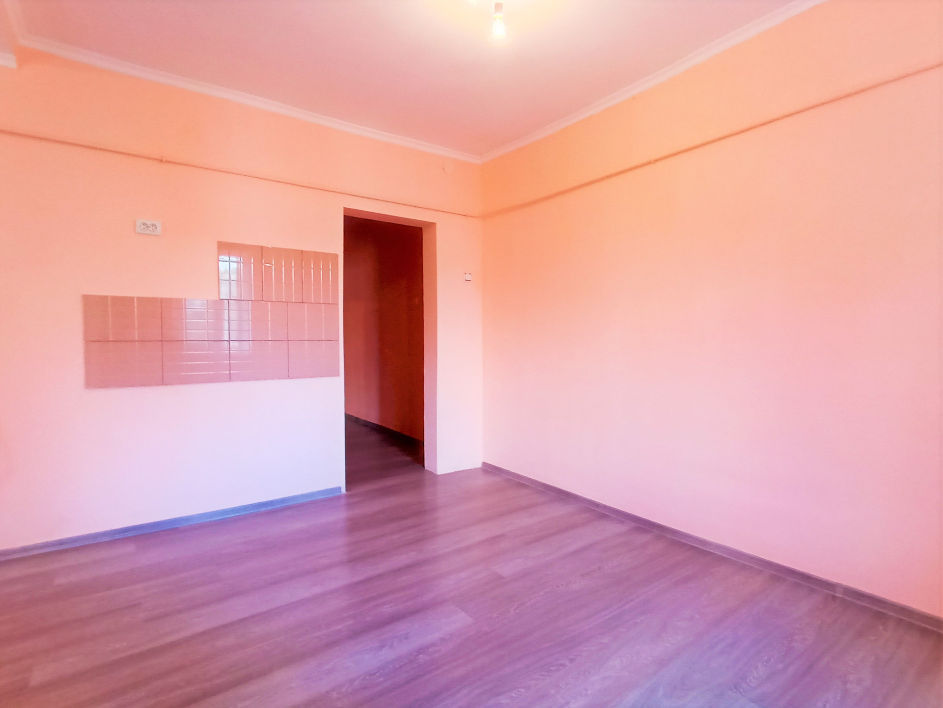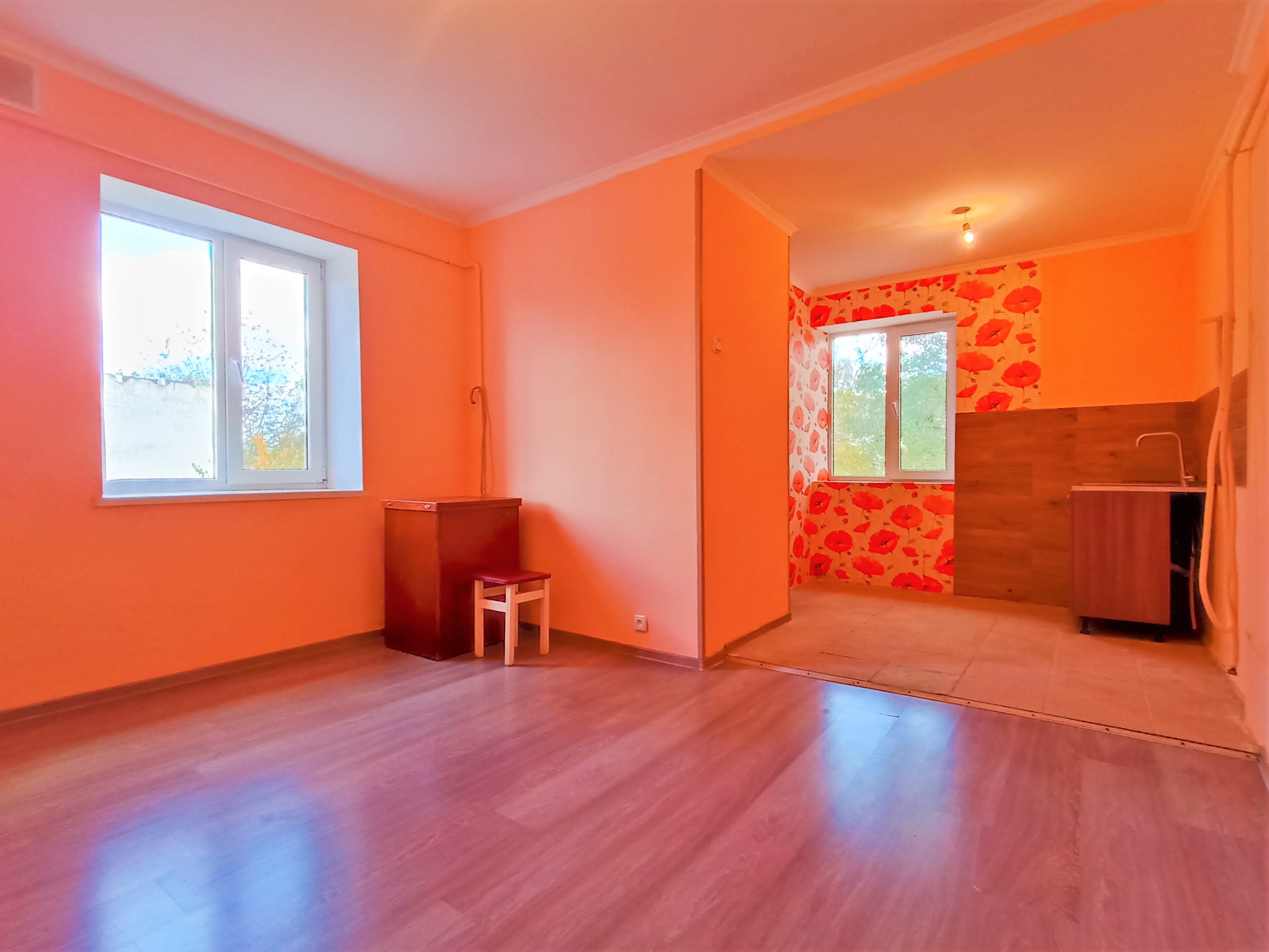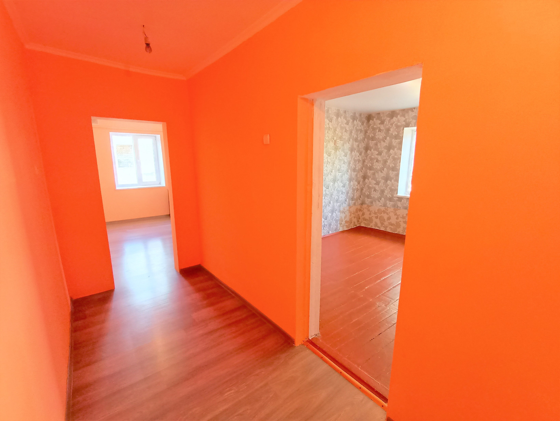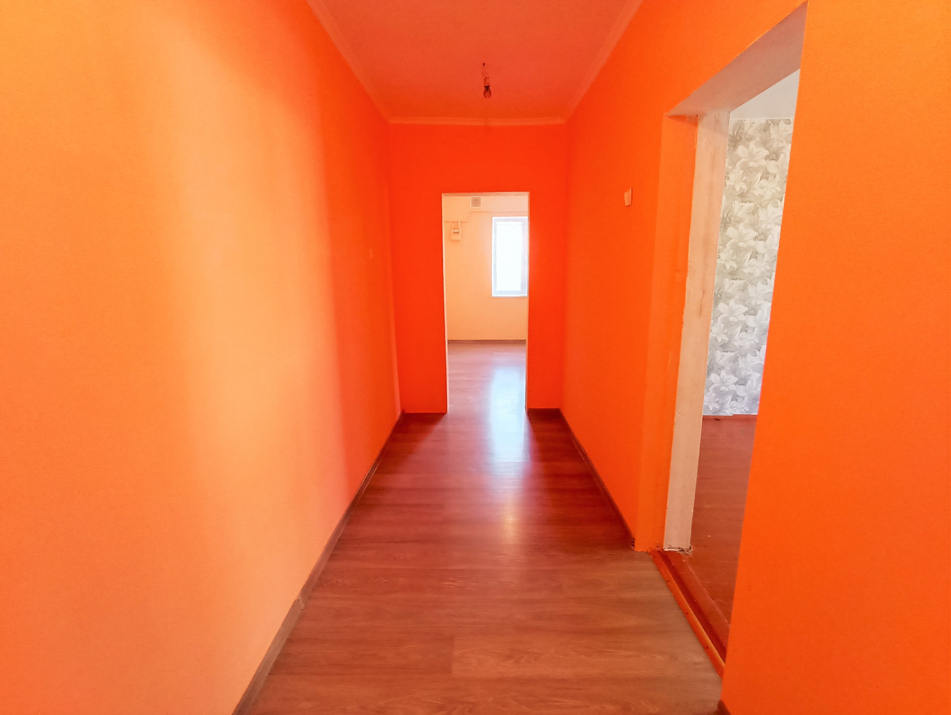 Отделка: косметический ремонт, стены выровнены и покрыты водоустойчивой краской (колер), поклеены обои, потолок покрыт белым матовым цветом, пол- ламинат, плинтусы и дерево.