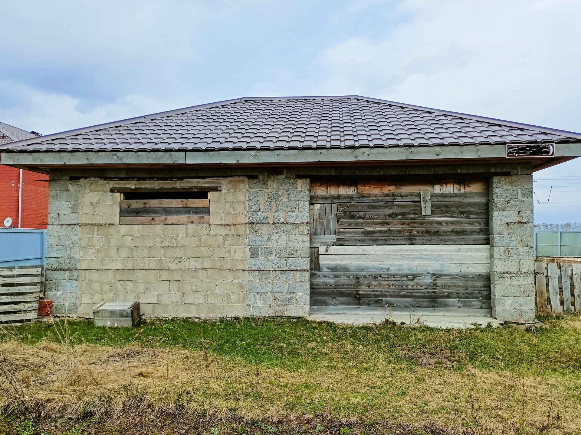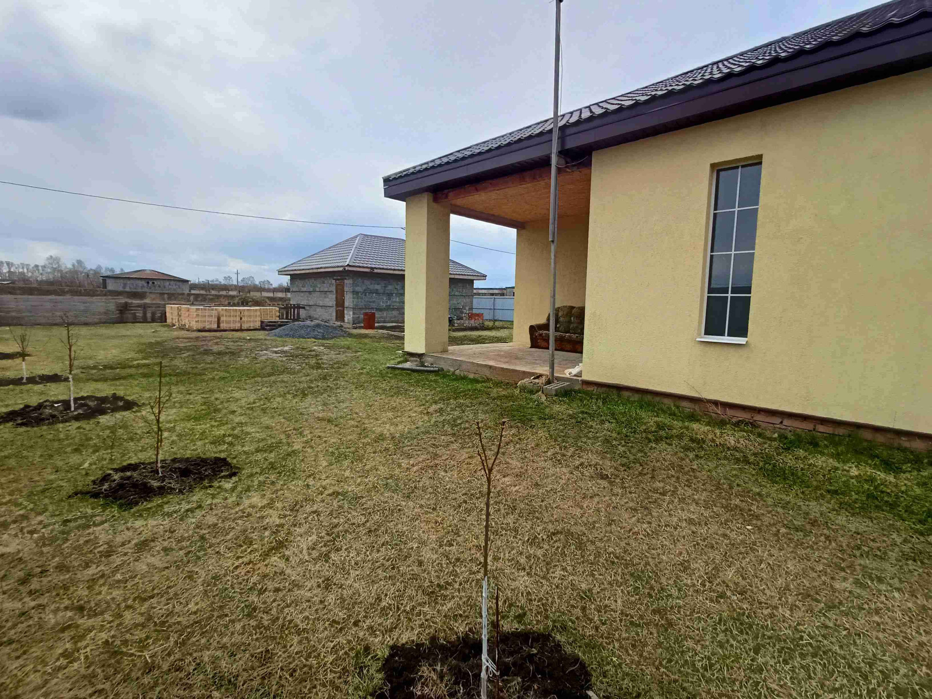 На участке ГАРАЖ на две машины, фундамент под баню, садовые деревья из питомников, ели, туи.