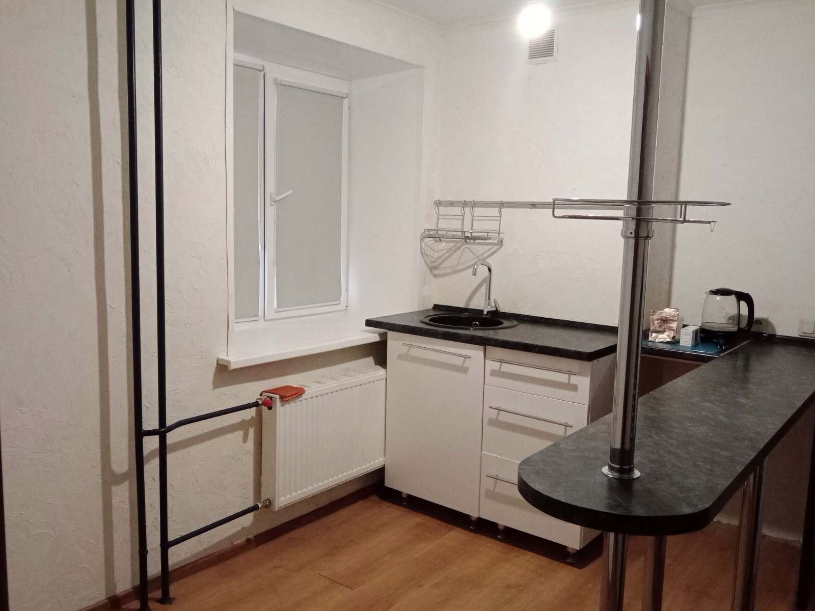 Кухня: сделана барная стойка , где вы с удобством сможете готовить любимые блюда и принимать гостей, окно с видом на придомовую территорию. . На кухне вам не будет тесно.На стенах-декоративная штукатурка 2 фактур.