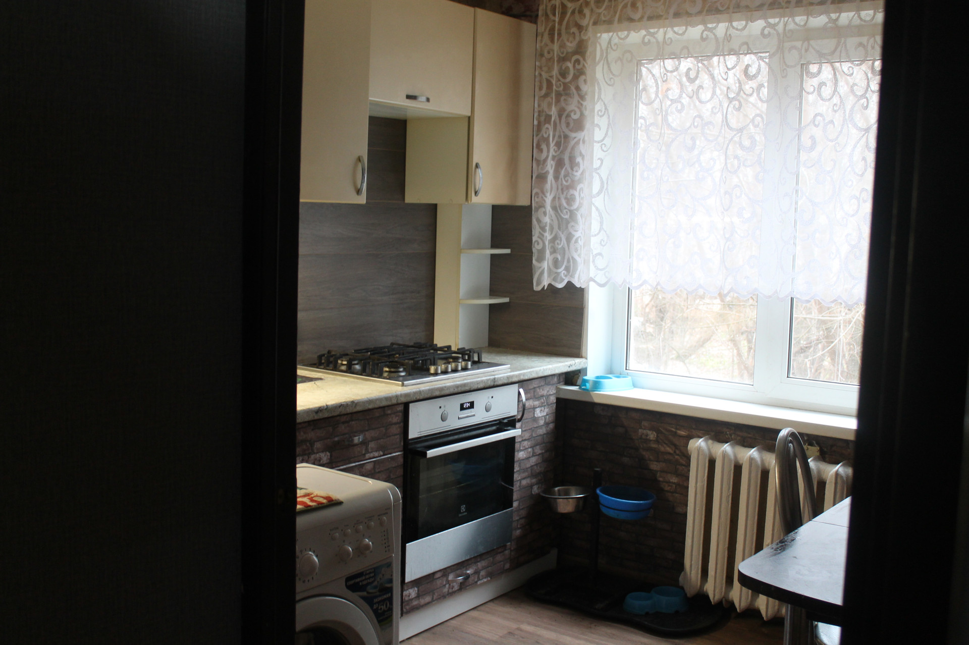 На кухне варочная поверхность Electrolux газовые конфорки, духовой шкаф электрический Electrolux. Можем оставить по желанию.