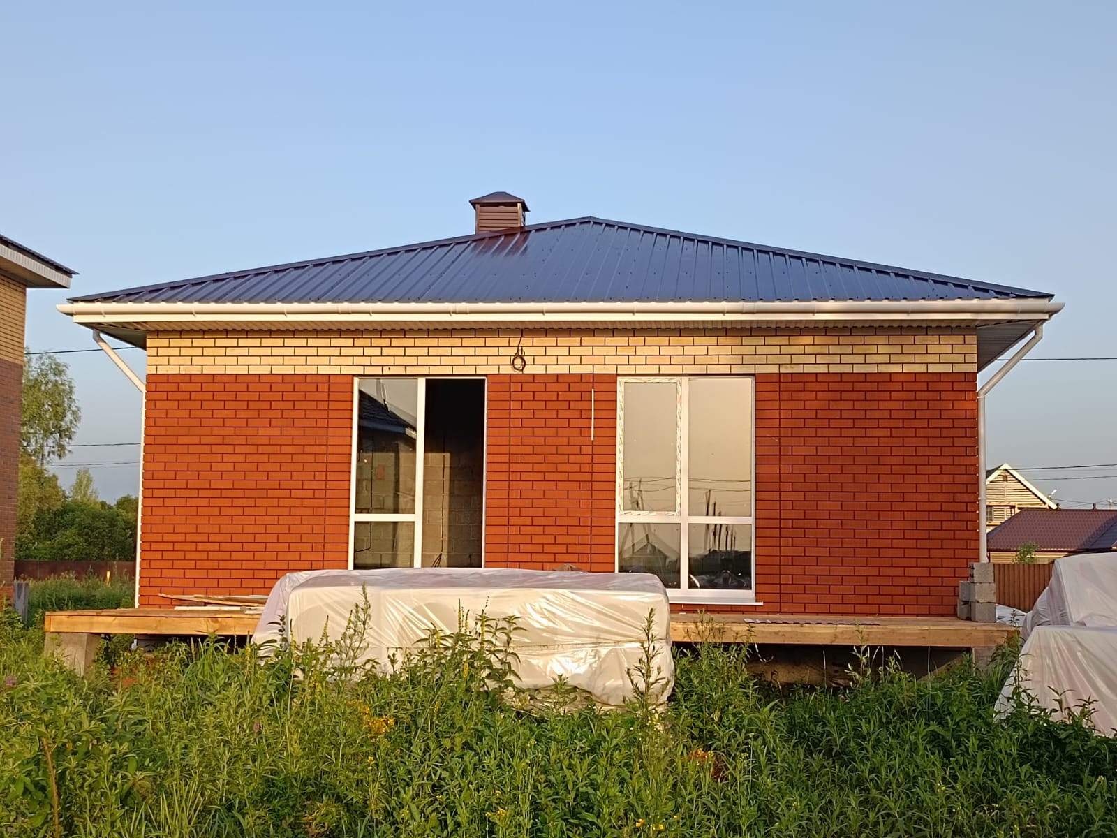 кровля - профнастил, ЖБ плиты перекрытия заводские, установлена водосточная система.