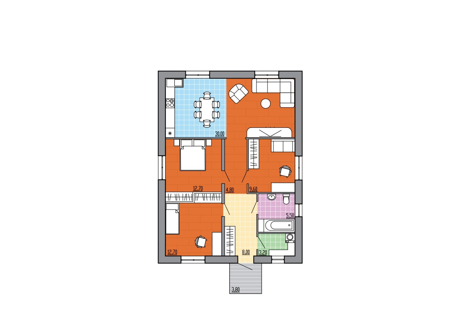 Проект дома: прихожая, бойлерная, кухня-гостиная, 3 спальные комнаты и ванная комната, крыльцо. Высота потолков составляет 2,9 м.