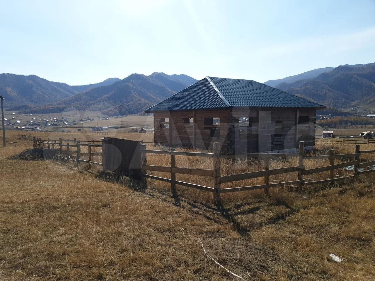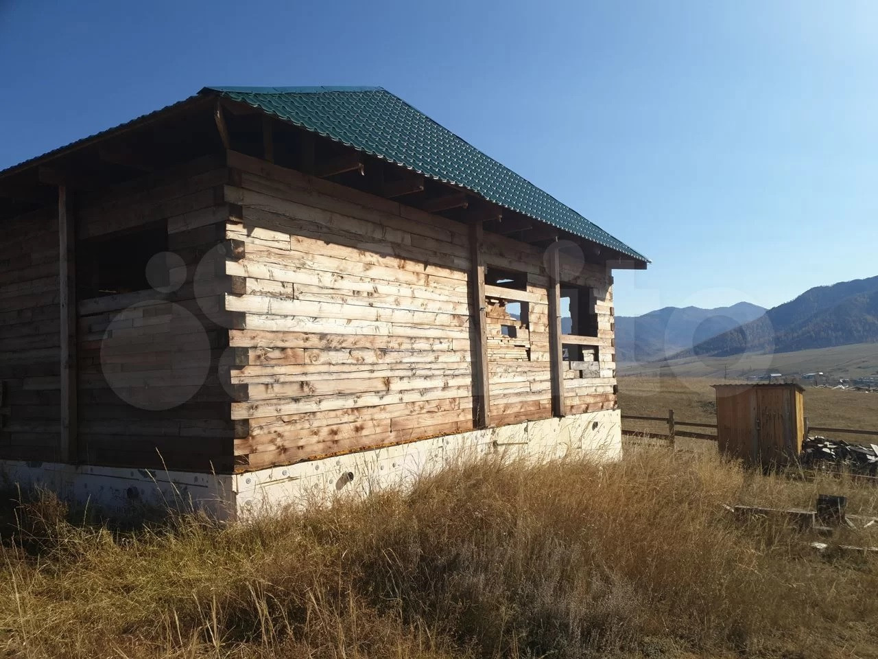 Дом из бруса, лиственница, 11х11, с крышей, армированным фундаментом. Усадка 3 года. Район Талда. Дом без окон, внутри двойной пол. На участке септик 4,5 куба. Периметр участка огорожен, есть ворота.