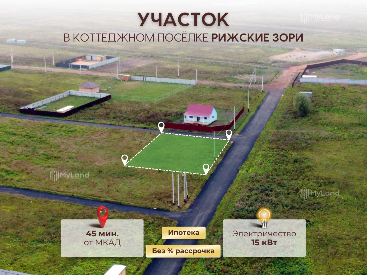Участок расположен всего в 47 минутах езды по скоростному Новорижскому шоссе от Москвы. Асфальтированный подъезд к поселку обеспечивает легкий доступ к вашему участку — удобно и быстро.