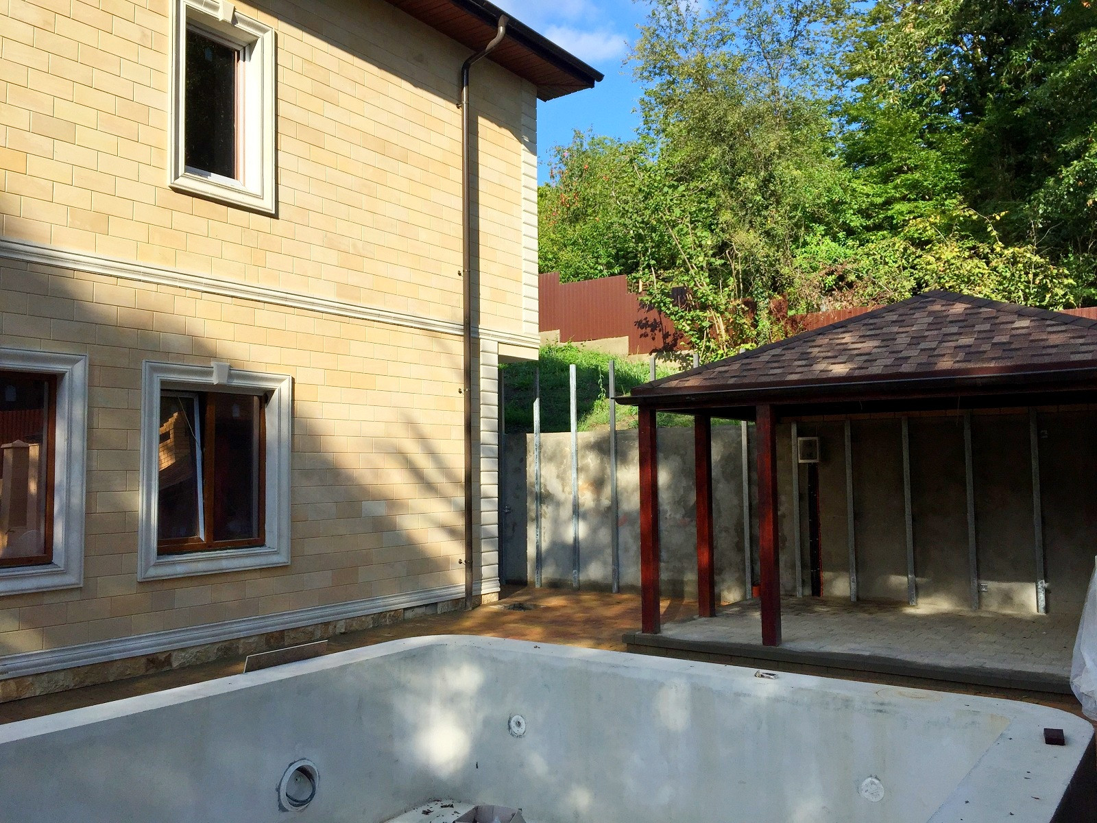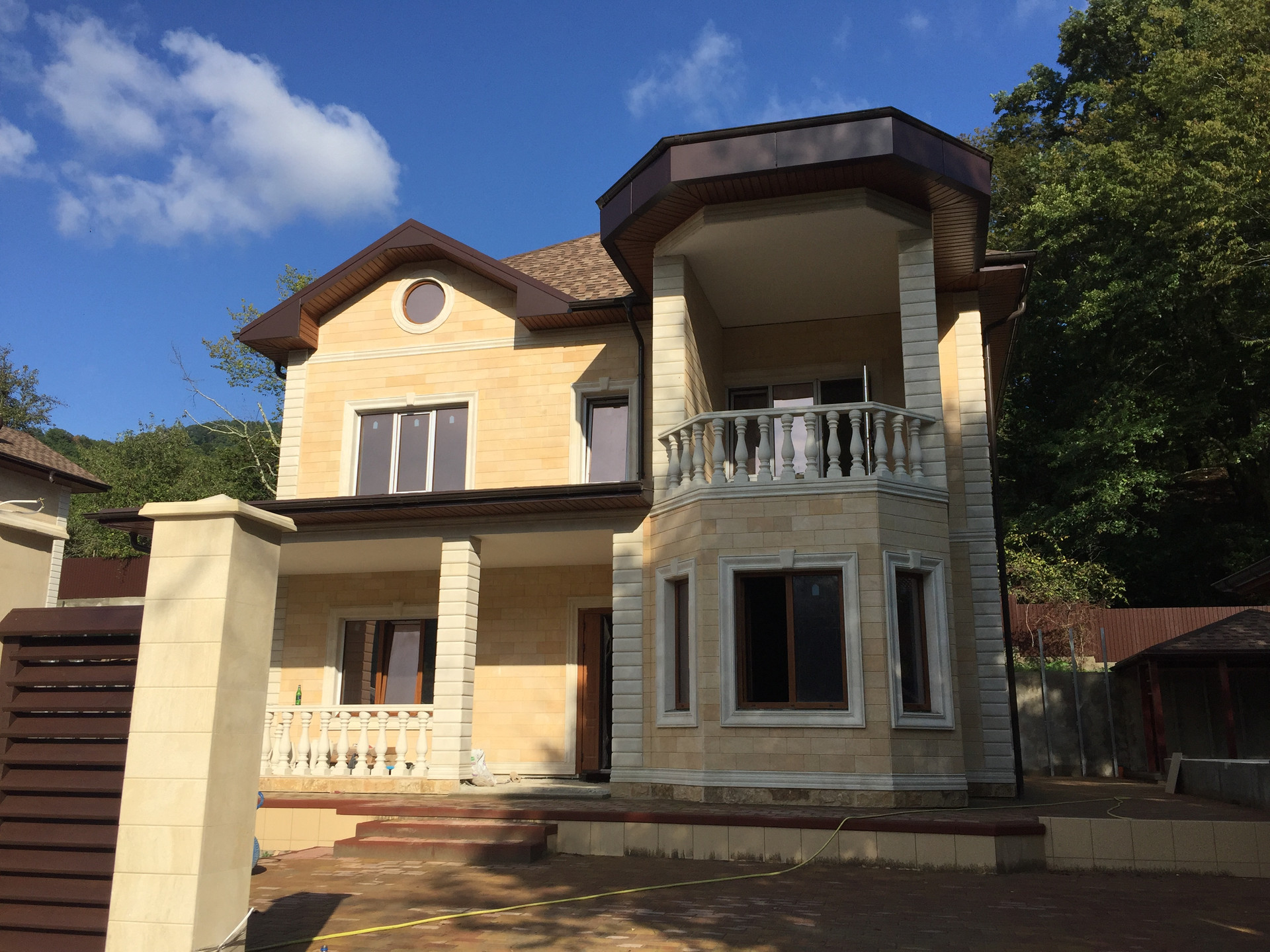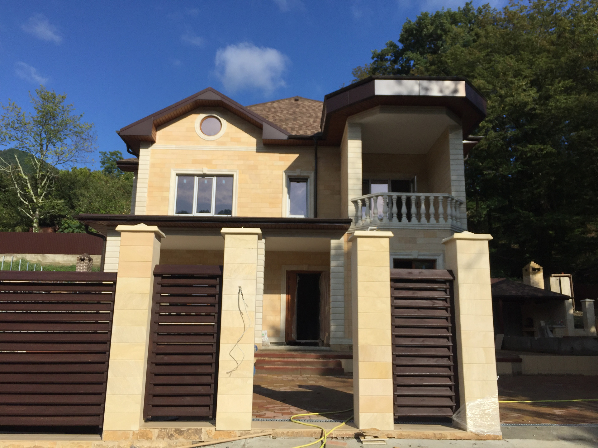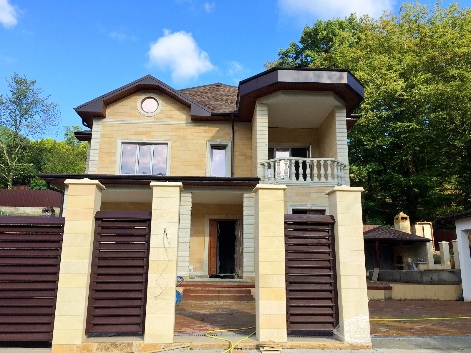 Территория участка так же облагорожена, высажены декоративные деревья,выложена плитка и сделана крытая терраса с зоной барбекю.