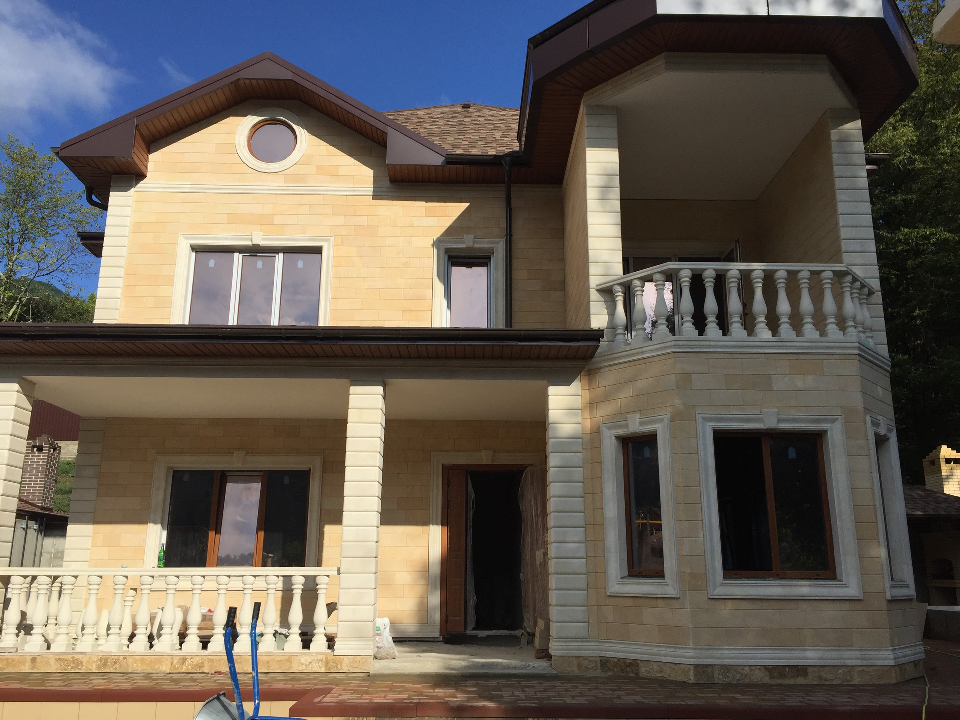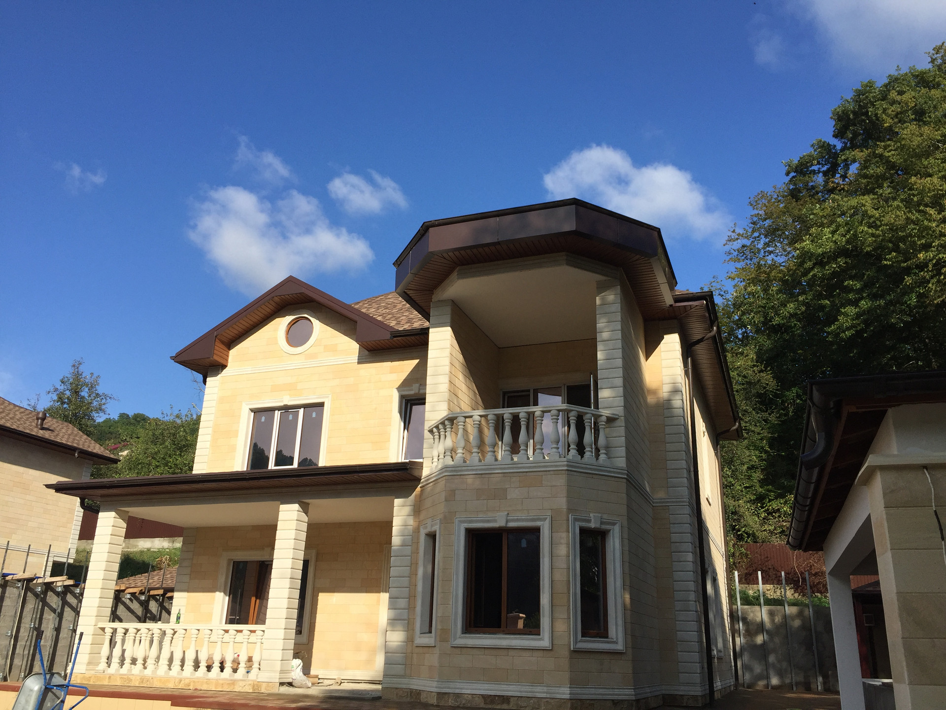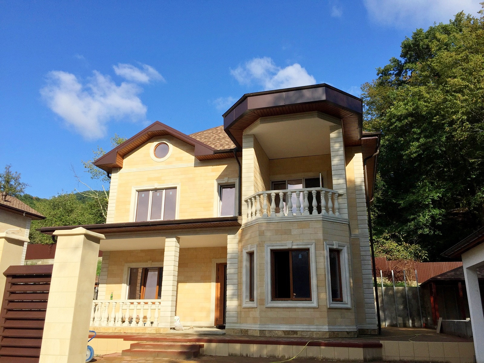 Территория участка так же облагорожена, высажены декоративные деревья,выложена плитка и сделана крытая терраса с зоной барбекю.