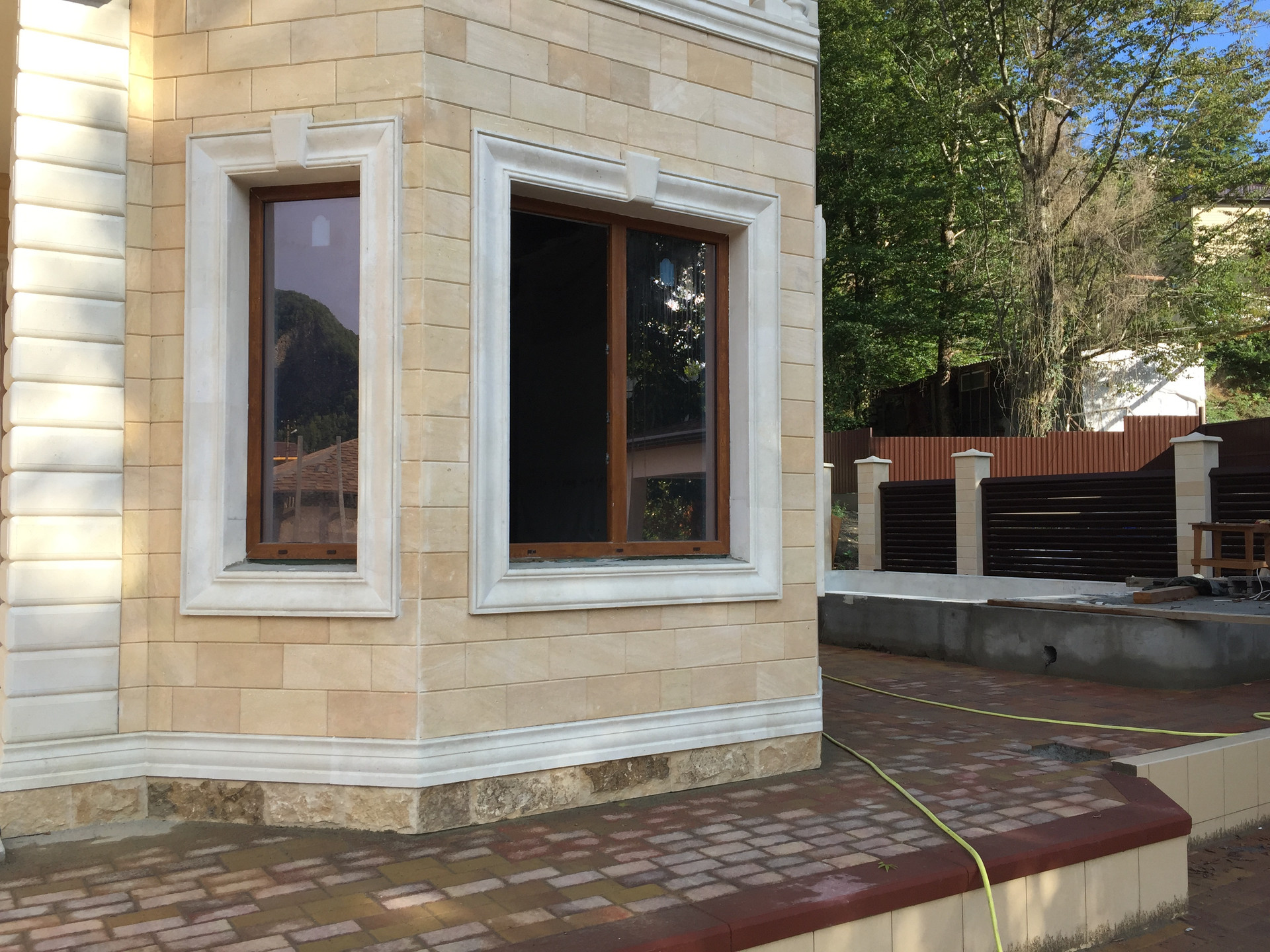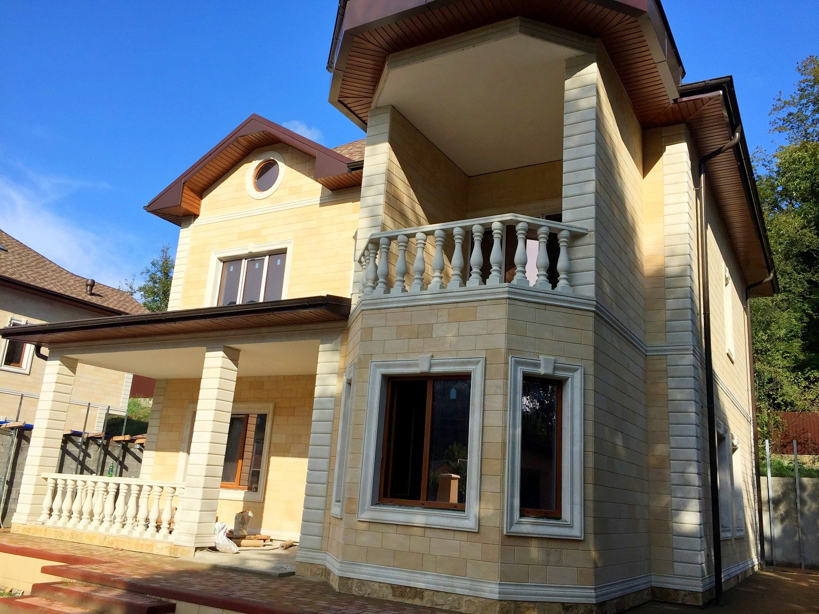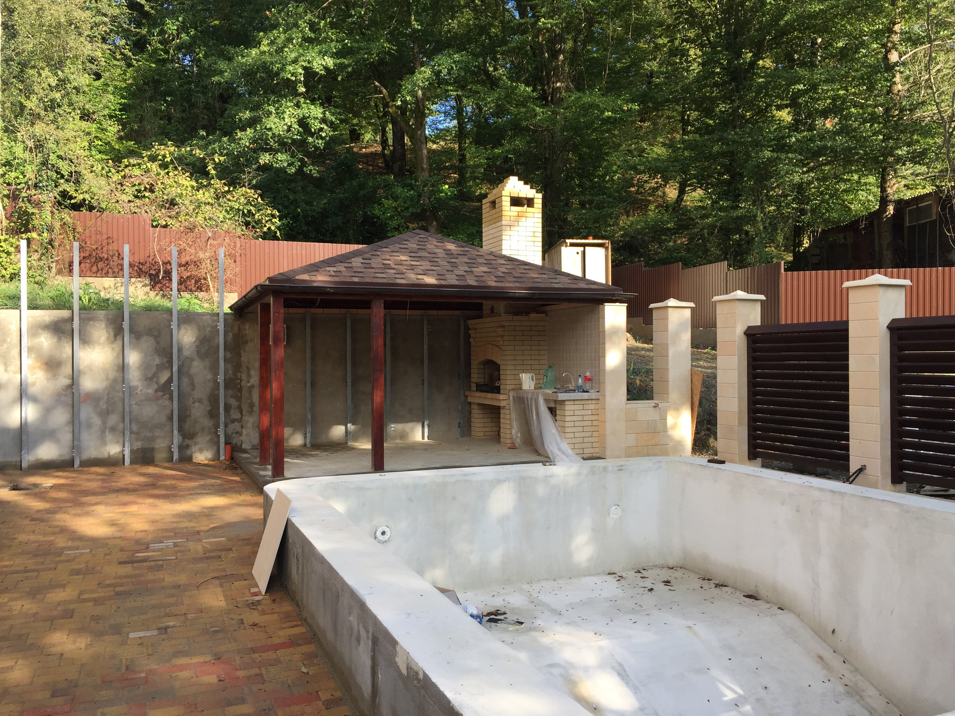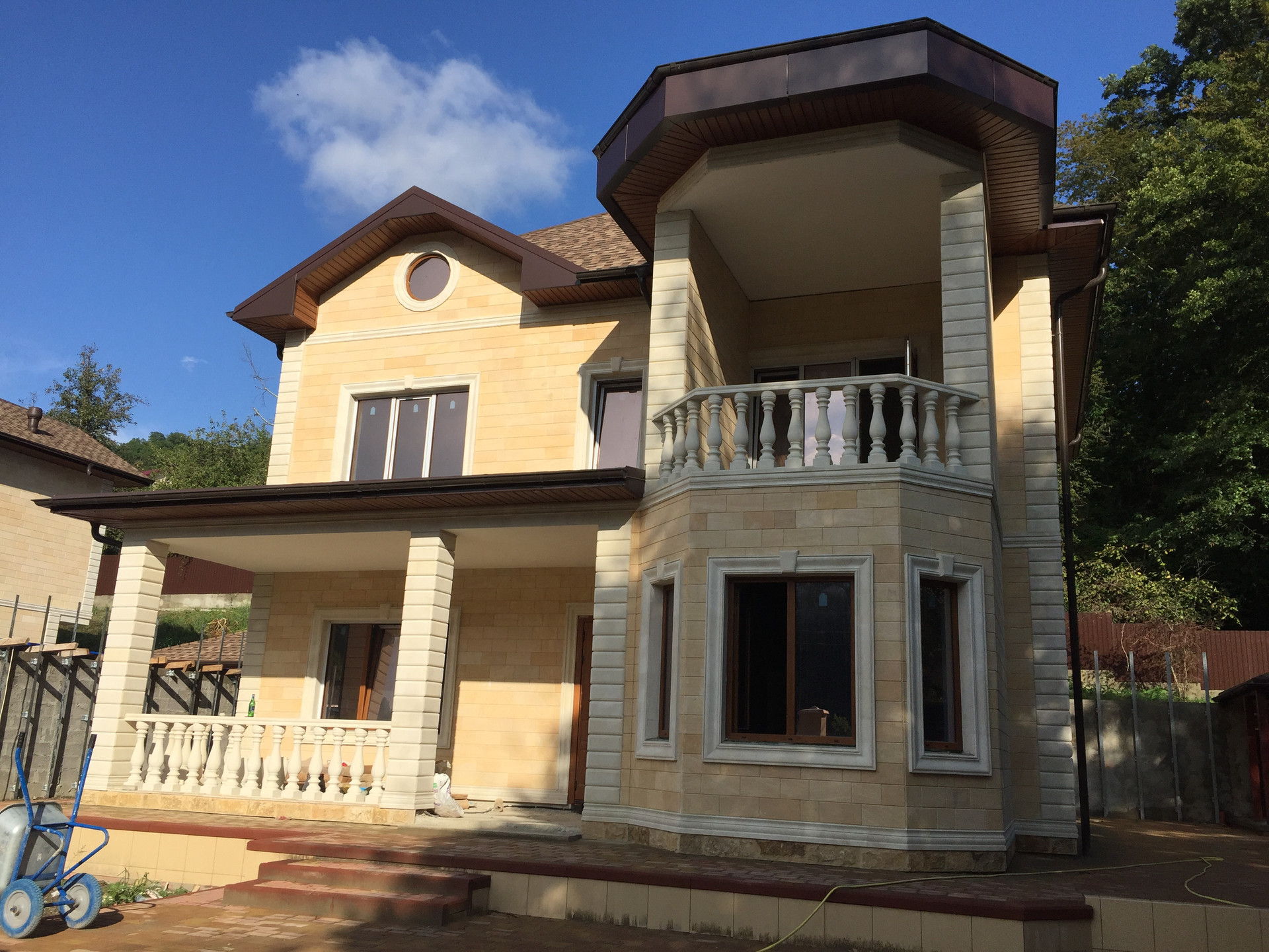 Территория участка так же облагорожена, высажены декоративные деревья,выложена плитка и сделана крытая терраса с зоной барбекю.