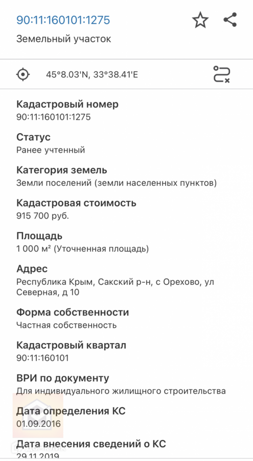КАДАСТРОВЫЙ НОМЕР :  90:11:160101:1275