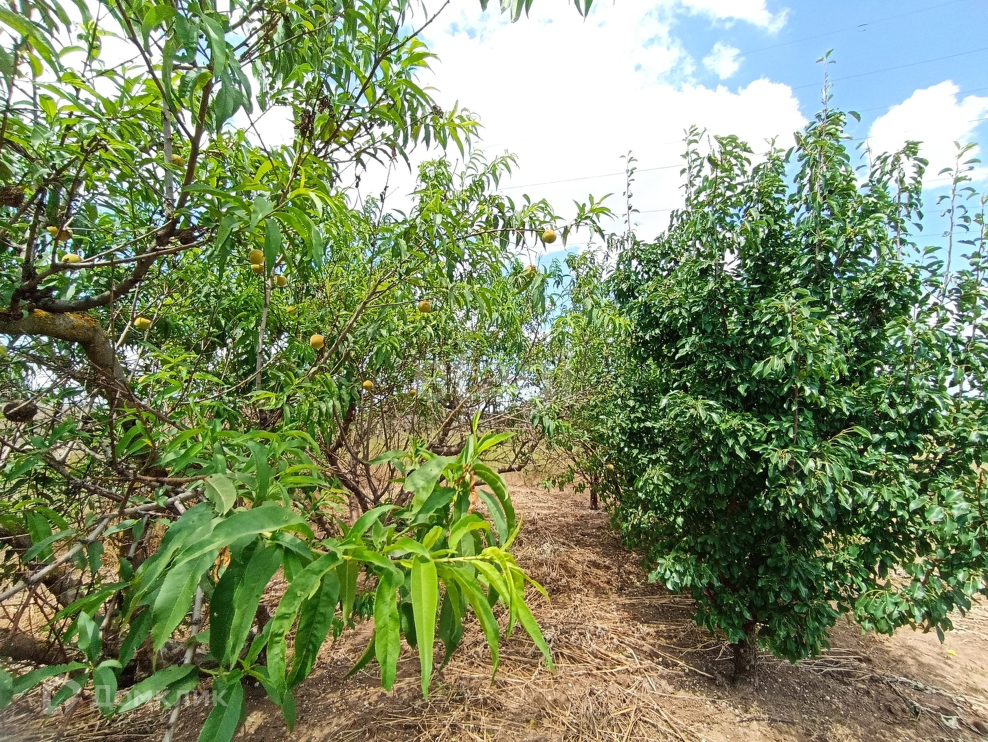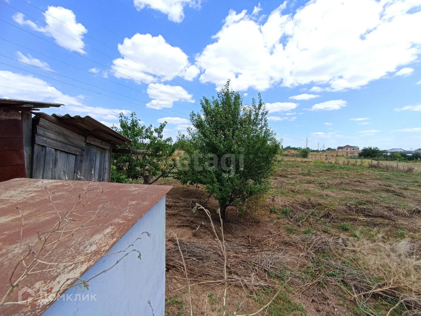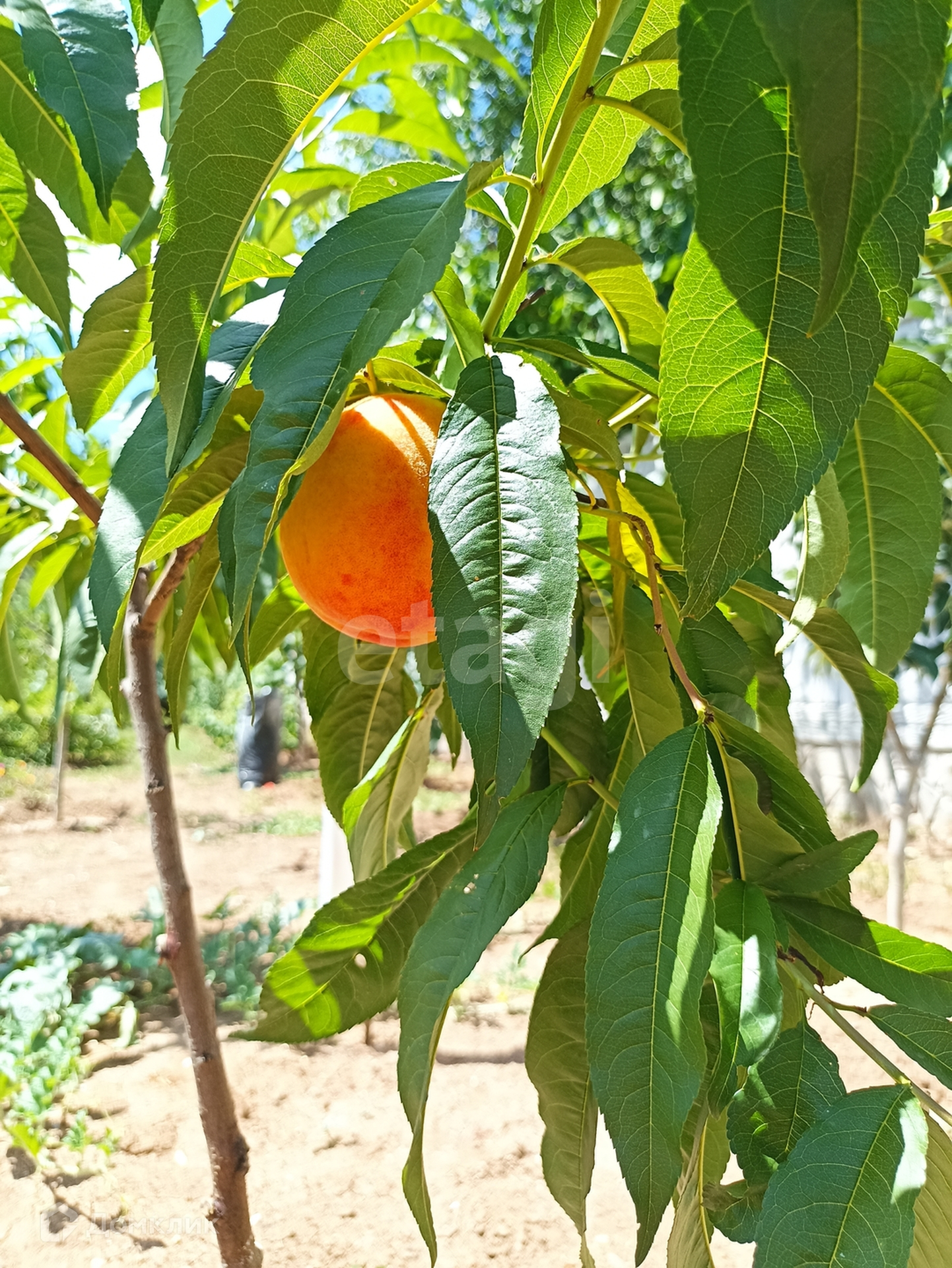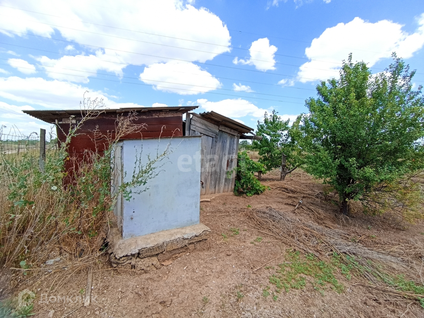 На участке посажены фруктовые деревья, есть хоз блог для хранения инструментов.