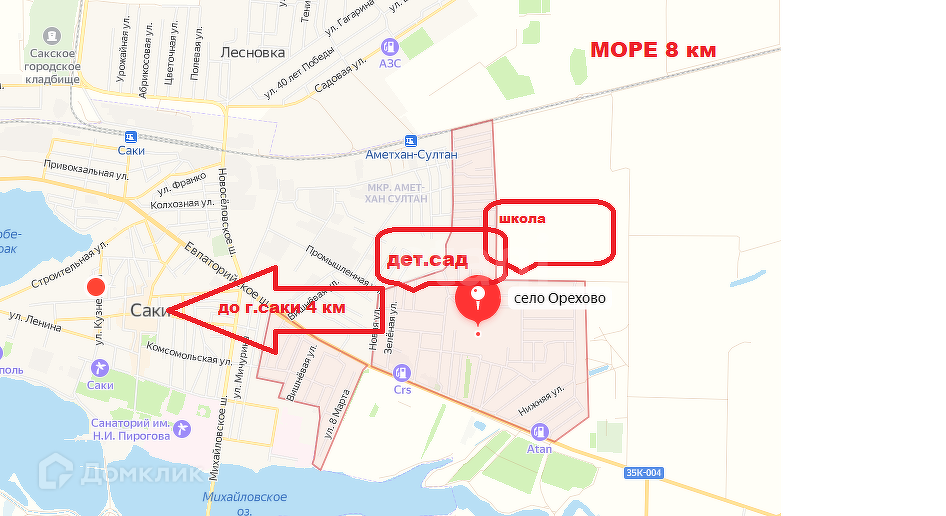От города Саки- 4км, Симферополь- 45км, Евпатория-27 км, до моря 7-км