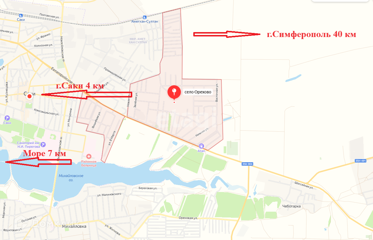 Центр посёлка с хорошо развитой инфраструктурой, находится в 1.2 км, город Саки — 4 км, море, с благоустроенным песчаным пляжем в 7 км от участка. Регулярное автобусное сообщение с городами Симферополь, Саки, Евпатория, пгт Новофёдоровка, маршрутки ходят каждые 20 минут.