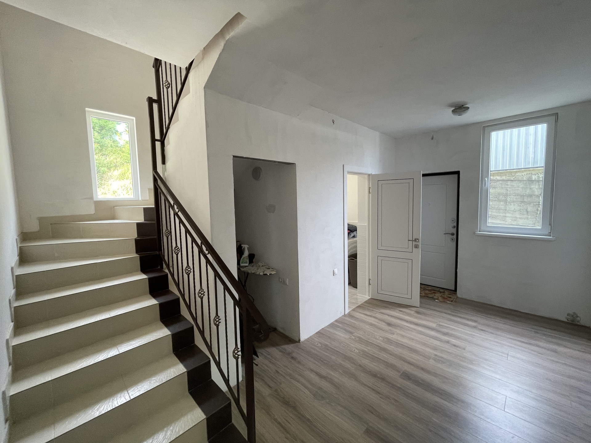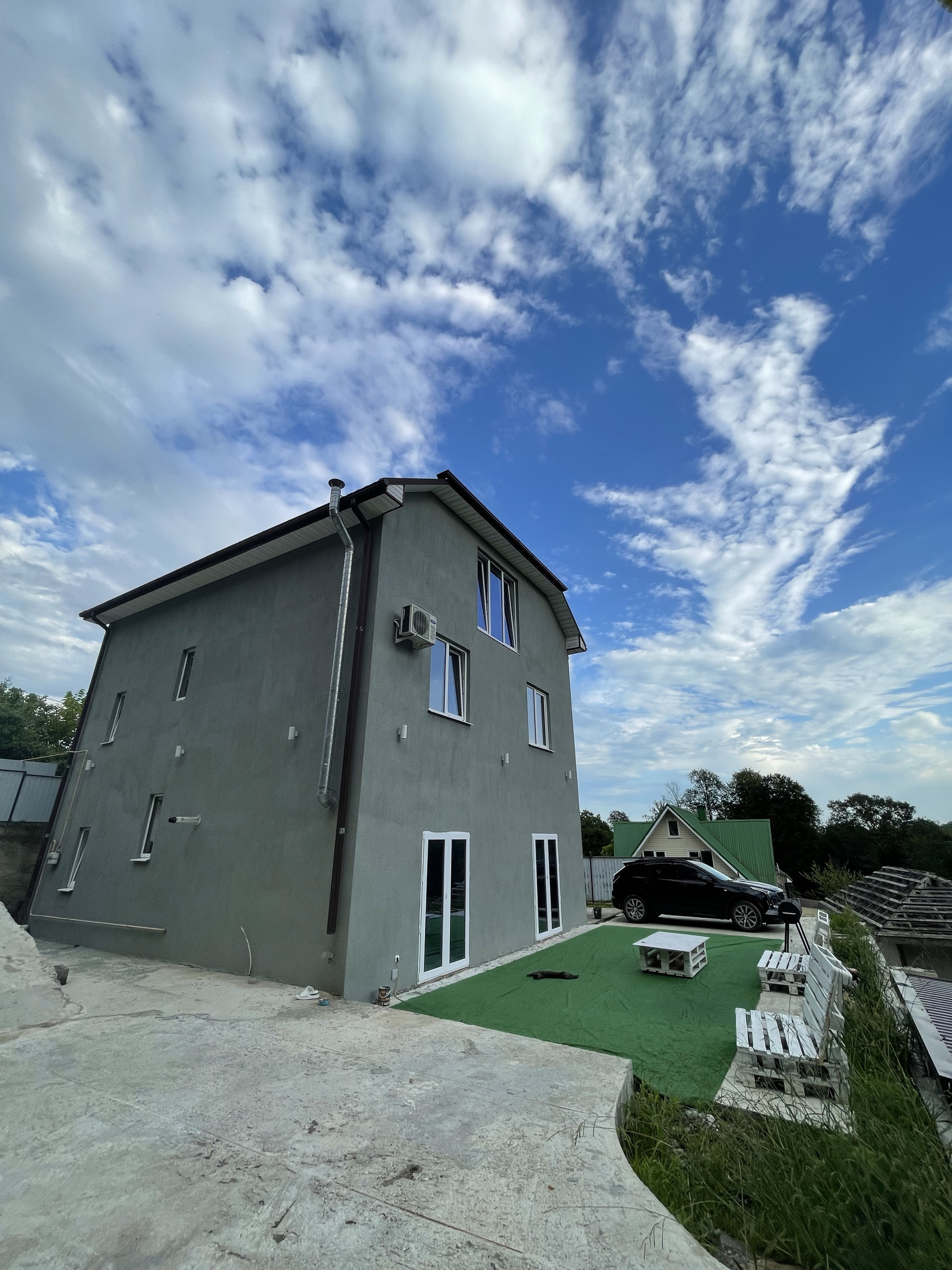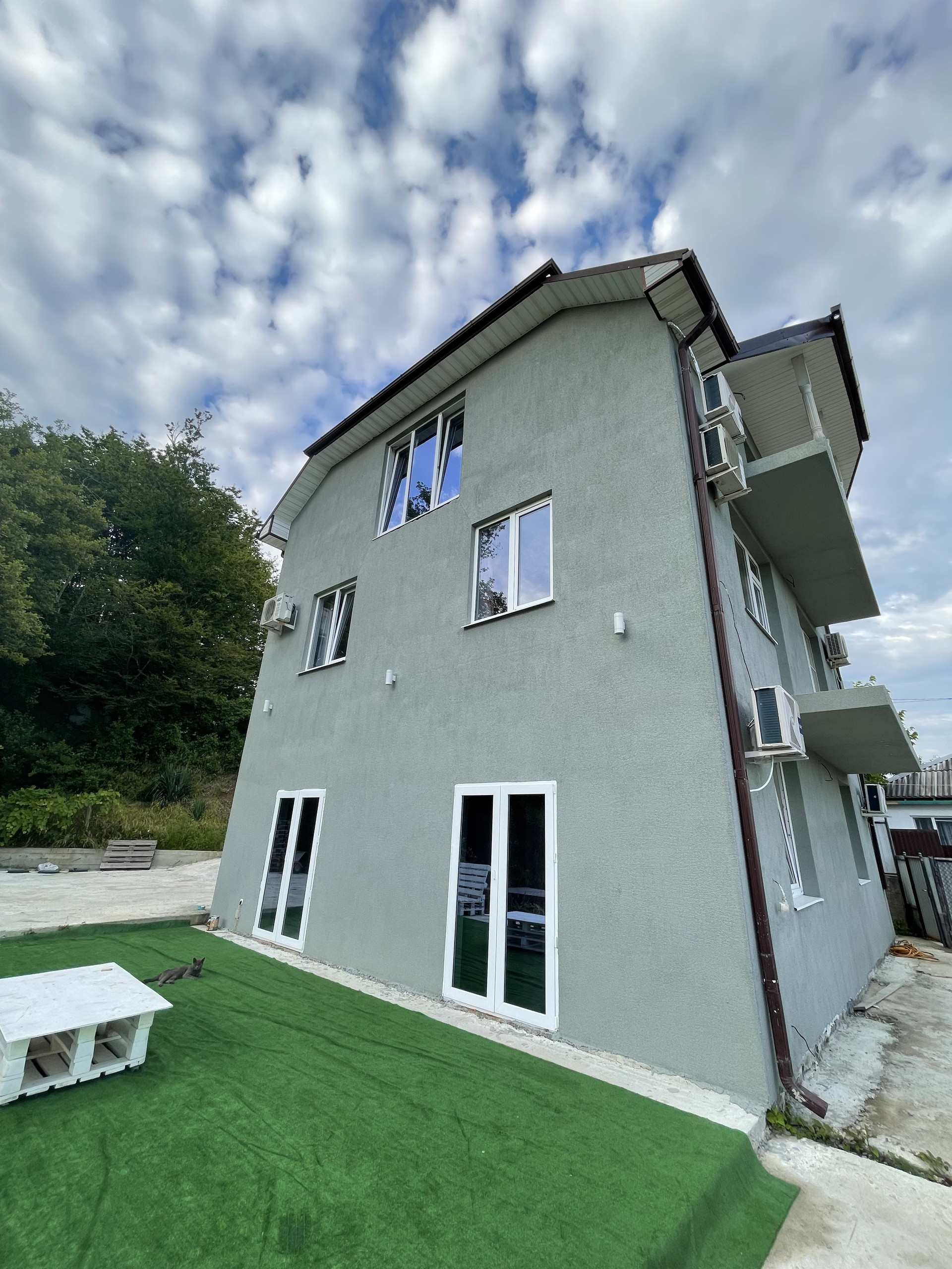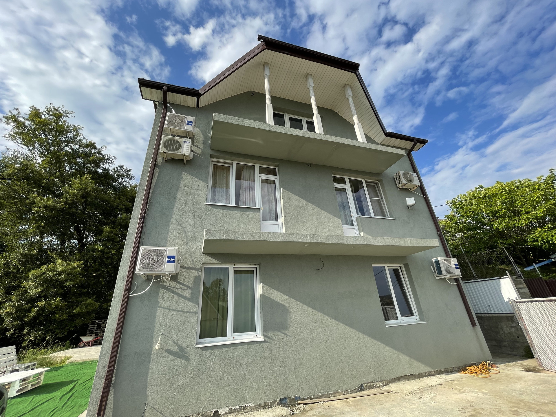 Блочный дом общей площадью 250 кв.м. (стены 25см.),3 уровня, кухня-столовая, 3 больших гостевых спальни и Мастер‐спальня (хозяйская),1 кабинет, 3 санузла, фасад оштукатурен (декоративная штукатурка), окрашен, утеплен пеноплексом, фундамент - ленточный монолитный, окна - ПВХ 82 профиль с заводской ламинацией, бетонная лестница, крыша - металлочерепица. Электричество разведено по дому, канализация (ЛОС, состоящая из четырех канализационных колодцев) и вода (скважина 80 м., насос с электронным управлением) - разведены по дому, газ. газовый котел, , разводка слаботочки и кондиционирования (кондиционер в каждой комнате и в столовой), паркинг во дворе на 3 машины.