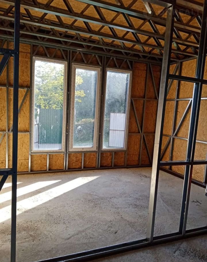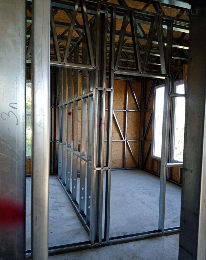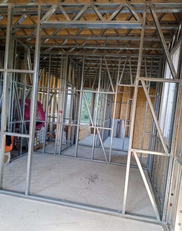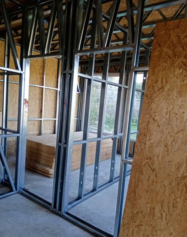 Дом построен из ЛСТК. Фундамент: подушка + сваи. Внутренней отделки нет.
