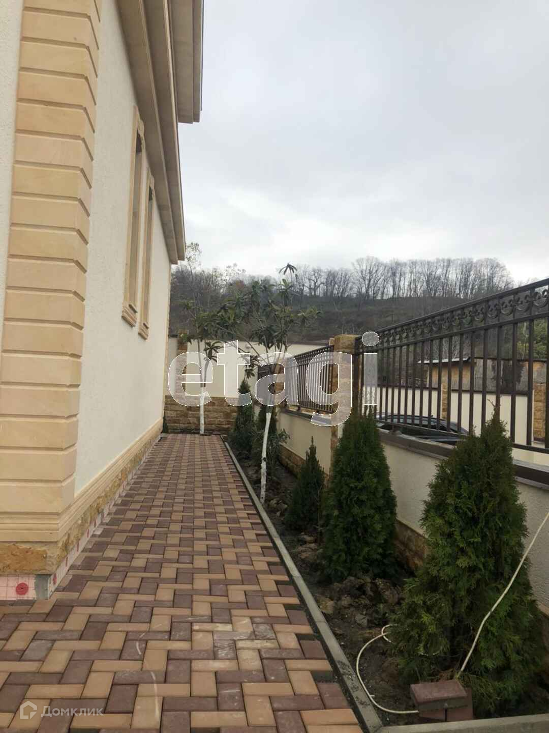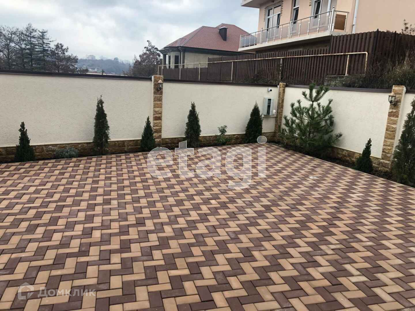 Территория огорожена и находится под видеонаблюдением, выложена брусчаткой, вдоль забора высажены вечнозеленые кустарники.