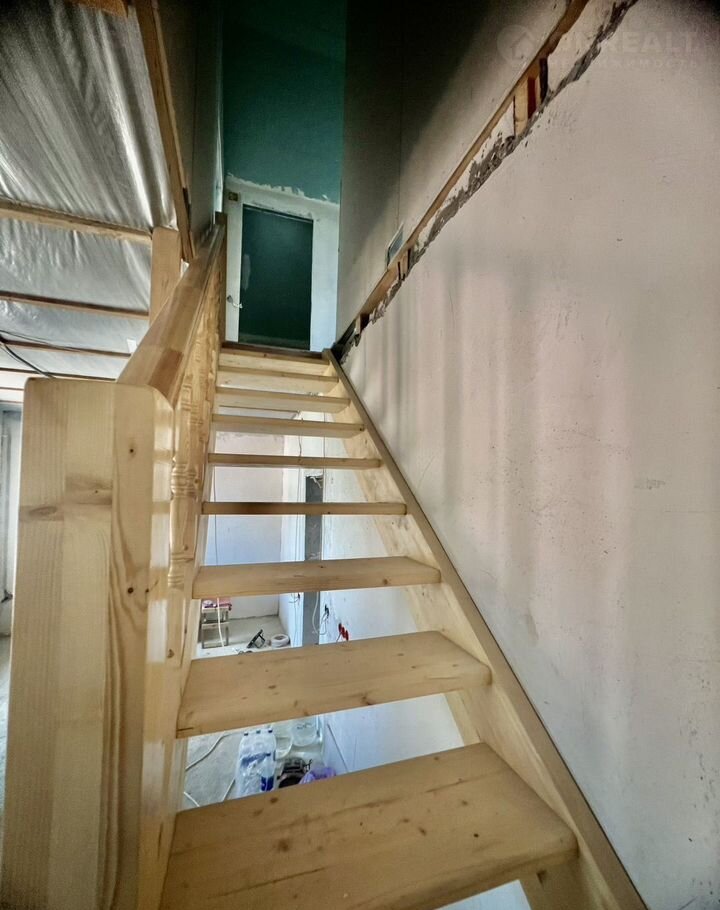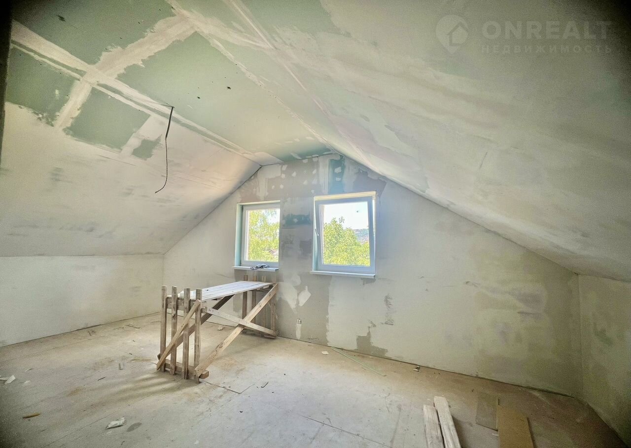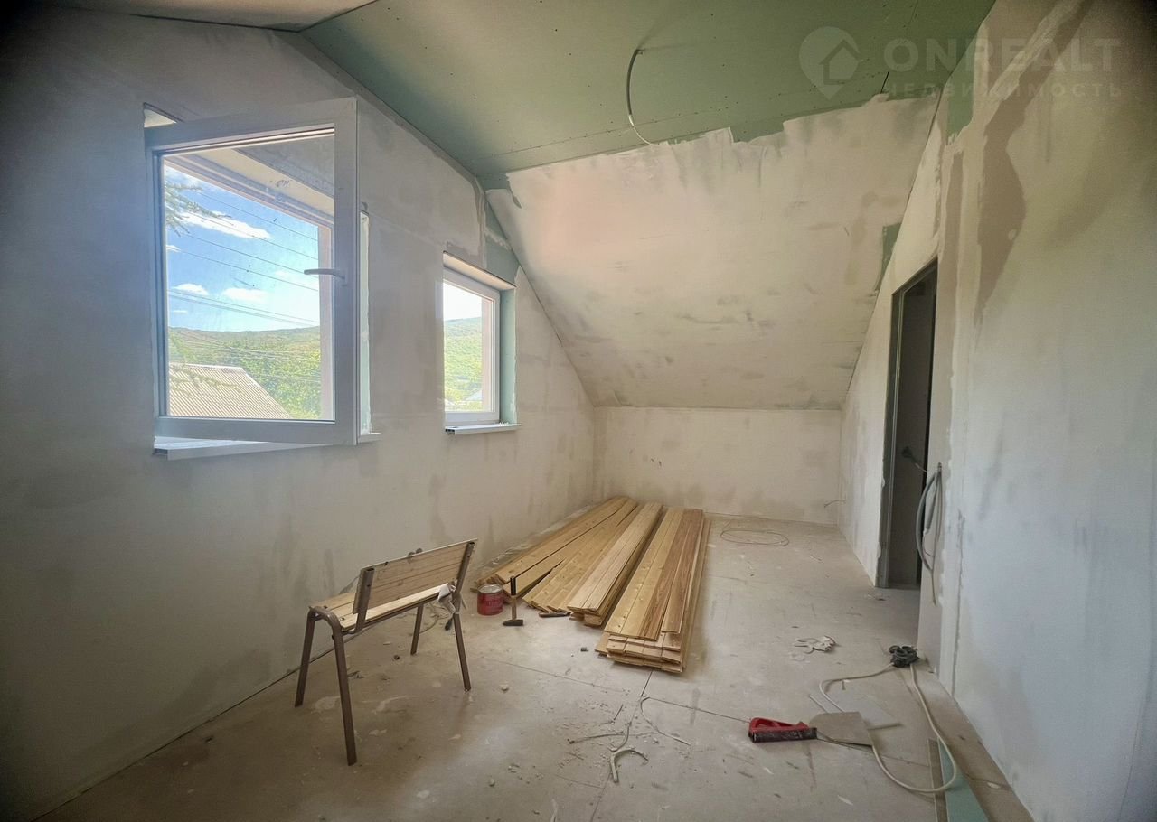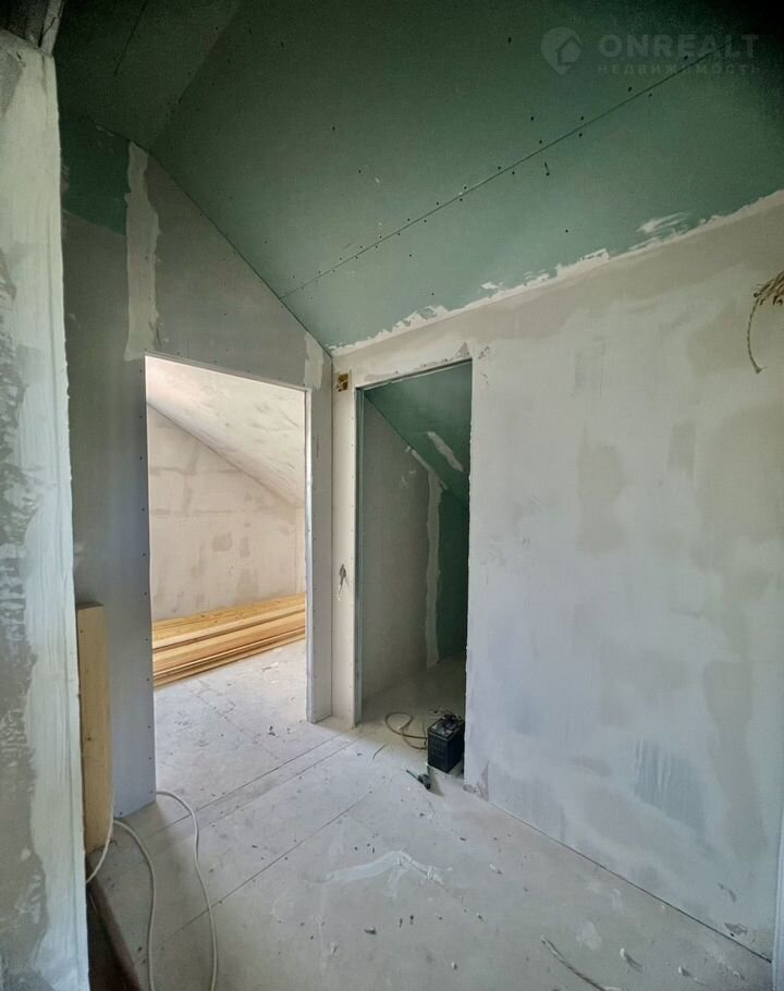В доме 2 этажа. На первом располагается : прихожая, комната свободного назначения, спальня, кухня-гостинная и совмещенный санузел. На второй этаж ведет новая деревянная лестница. На втором этаже располагаются две спальни и помещение, которое можно использовать как дополнительный санузел или гардеробную. Одна комната готова к проживанию. Остальные помещения в предчистовой отделке.