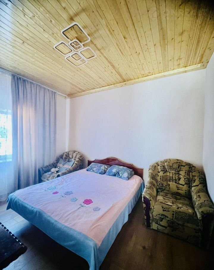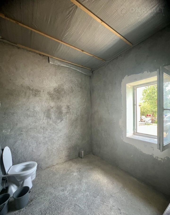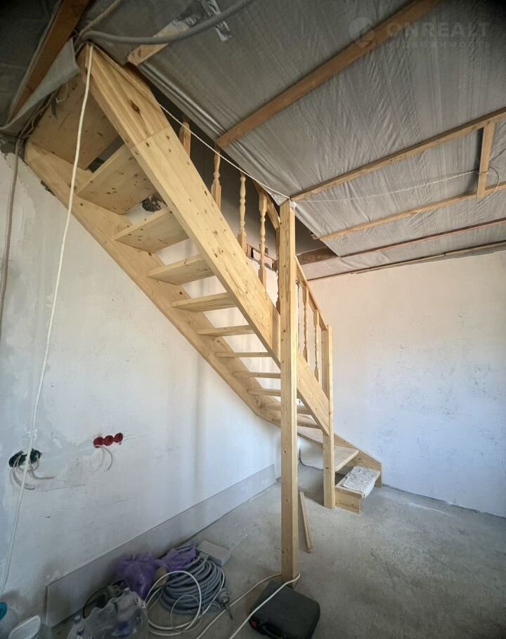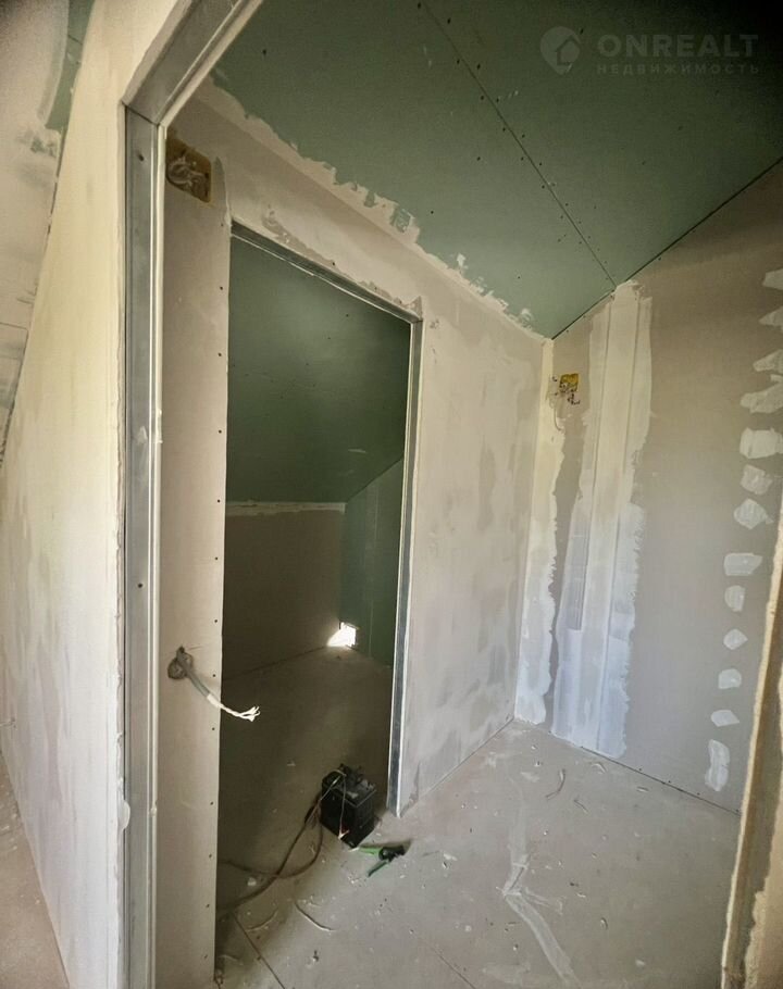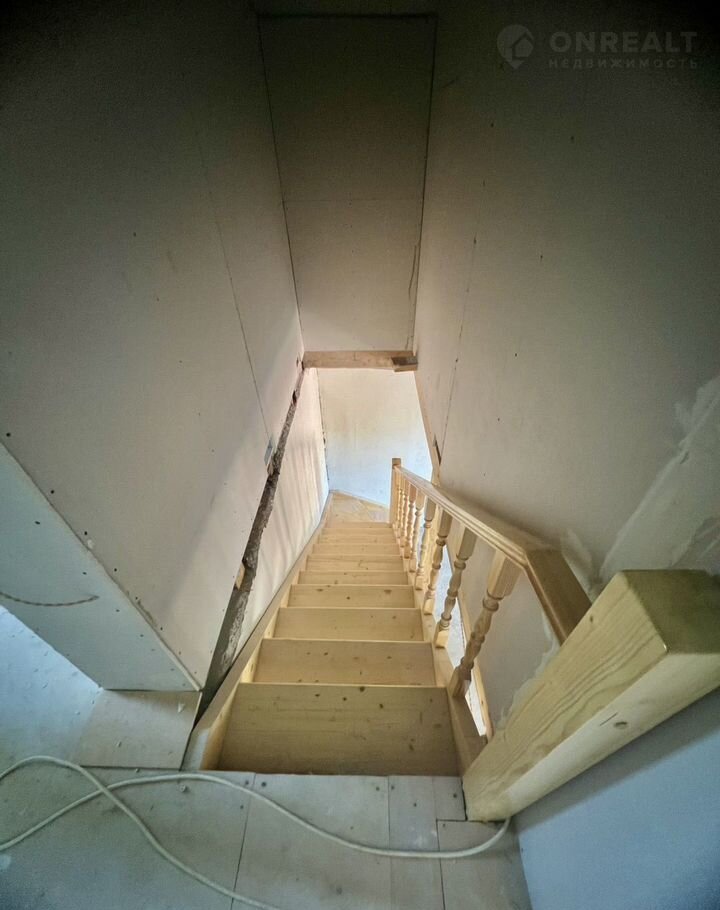 В доме 2 этажа. На первом располагается : прихожая, комната свободного назначения, спальня, кухня-гостинная и совмещенный санузел. На второй этаж ведет новая деревянная лестница. На втором этаже располагаются две спальни и помещение, которое можно использовать как дополнительный санузел или гардеробную. Одна комната готова к проживанию. Остальные помещения в предчистовой отделке.