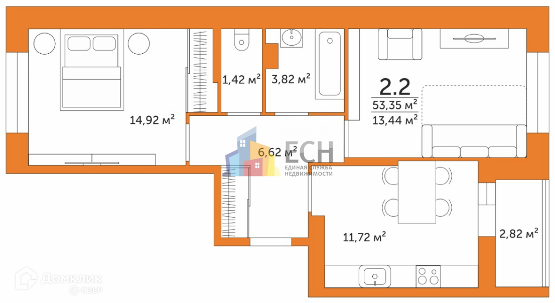 Общая площадь 53.35 м2