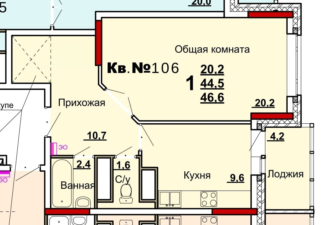 Общая площадь 44.5 м2