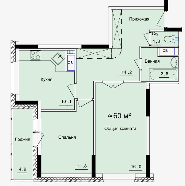 Общая площадь 60.1 м2