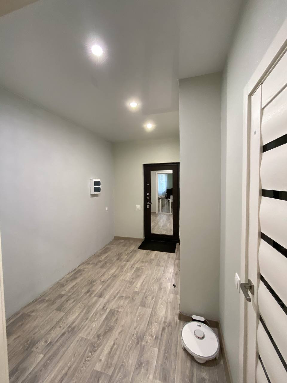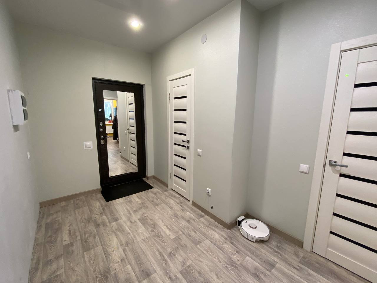 В коридоре ниша 3,5 метра для огромного встроенного шкафа-купе. Входная дверь с панорамным зеркалом, которое отражает естественный свет из комнат, за счет этого всегда ощущение пространства и света.