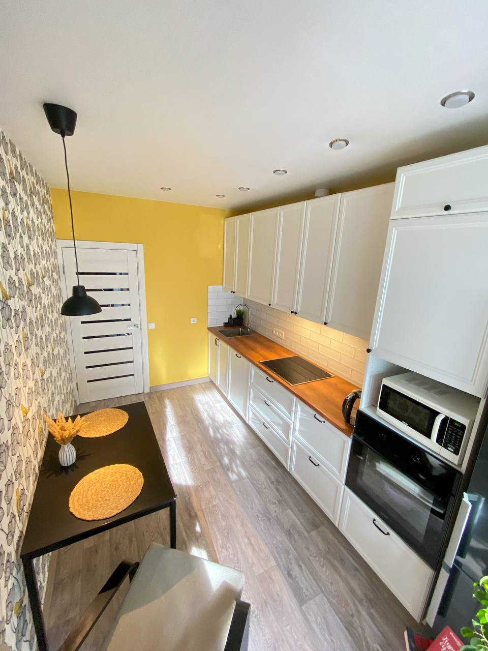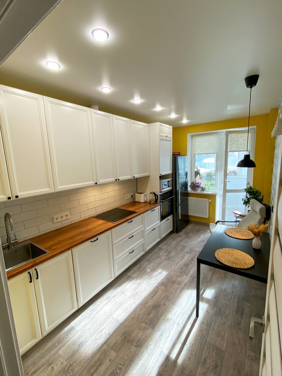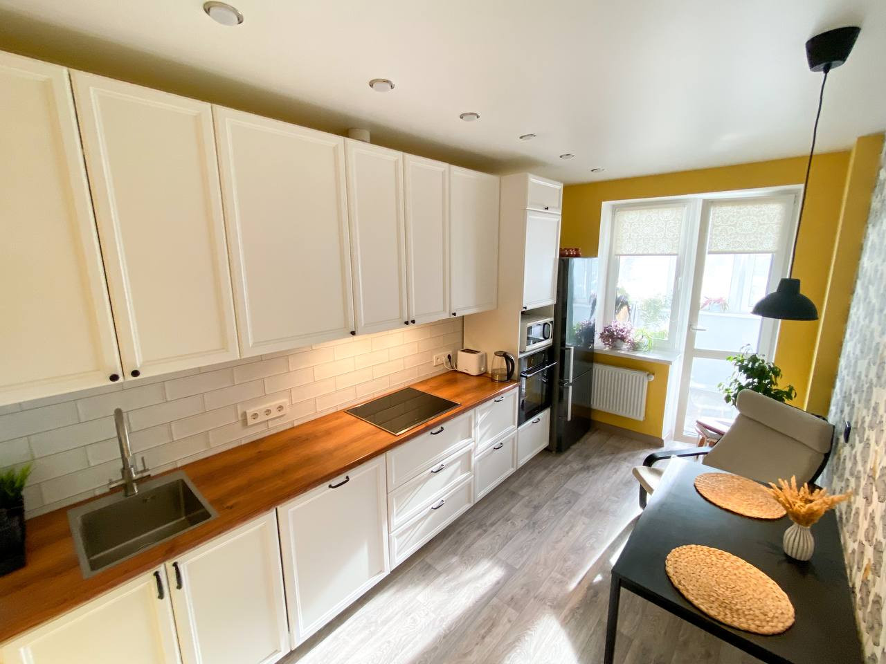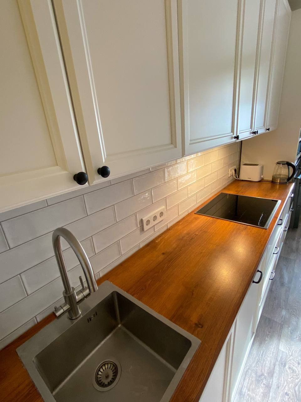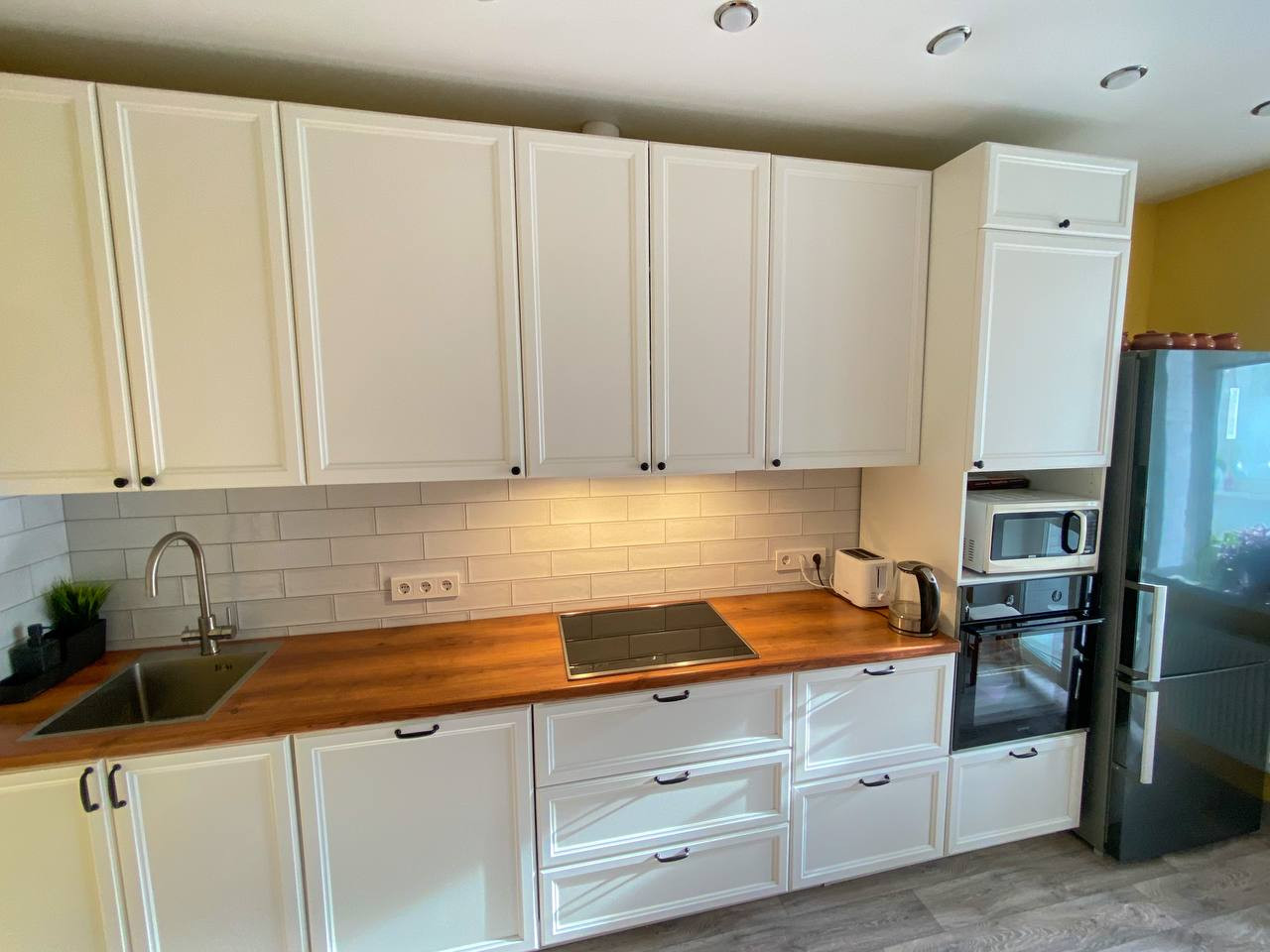 Остается качественная кухня с рабочей зоной 2,8 метра и с частью бытовой техники. Оборудована топовой фурнитурой Hettich - бесшумные ящики с большой грузоподъёмностью и двери с доводчиками. Фартук выложен дорогой испанской керамикой Monopole Ceramica с потрясающими переливами глазури.