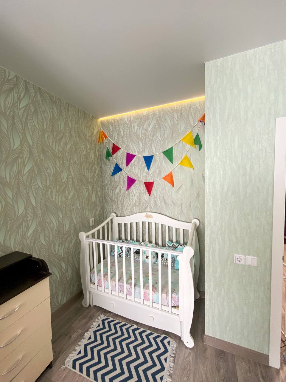 В комнате выполнена трехслойная звукоизоляция стен с использованием материалов Rockwool Acoustic Баттс 50мм, евро маты и звукопоглощающий ГВЛВ, из соседней квартиры не слышно ни звука. Есть фото процесса монтажа звукоизоляции. Смонтирован светильник парящий потолок, эстетичный и удобный ночник с управлением с выключателя.