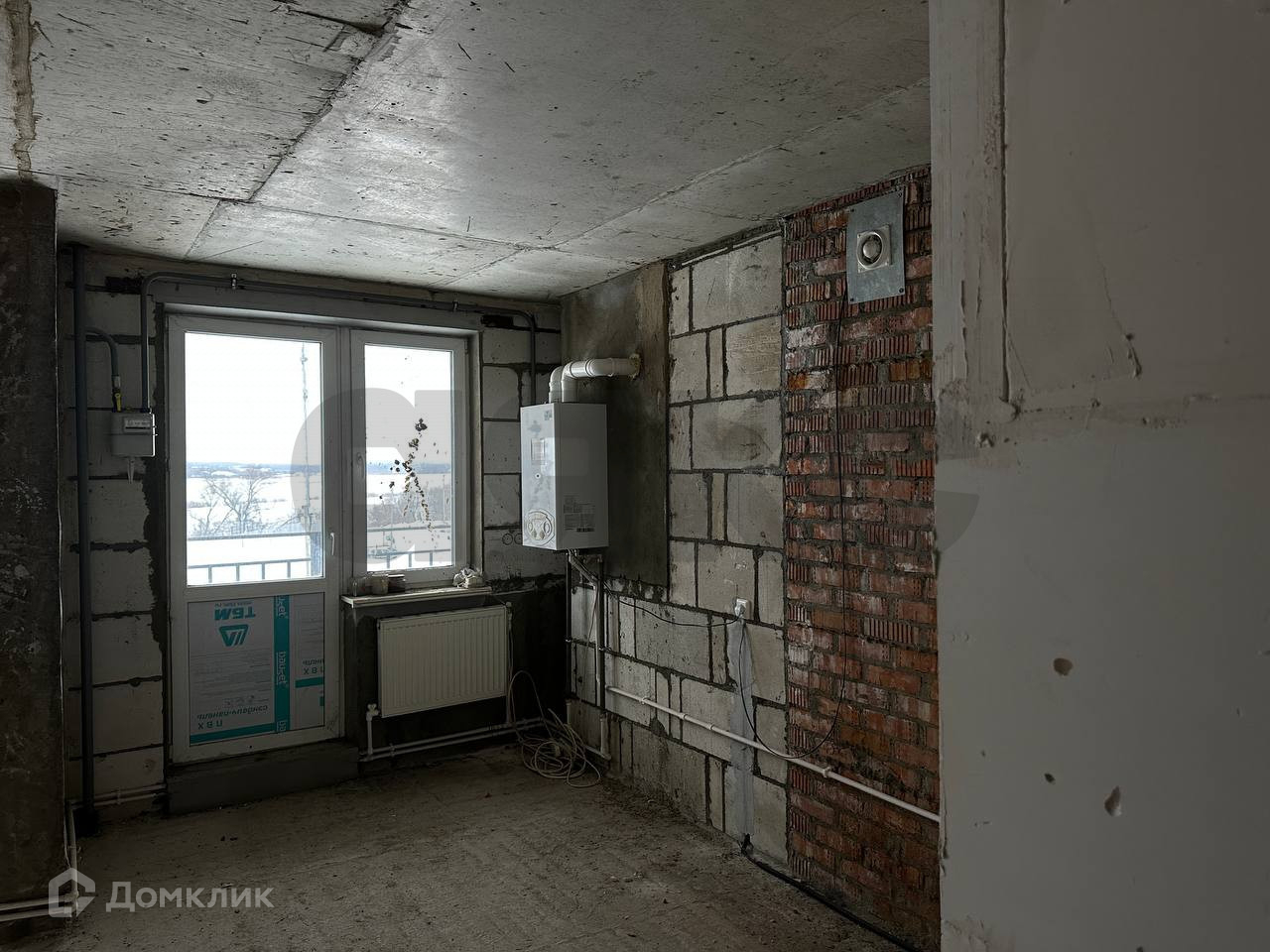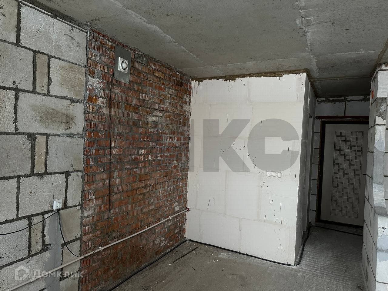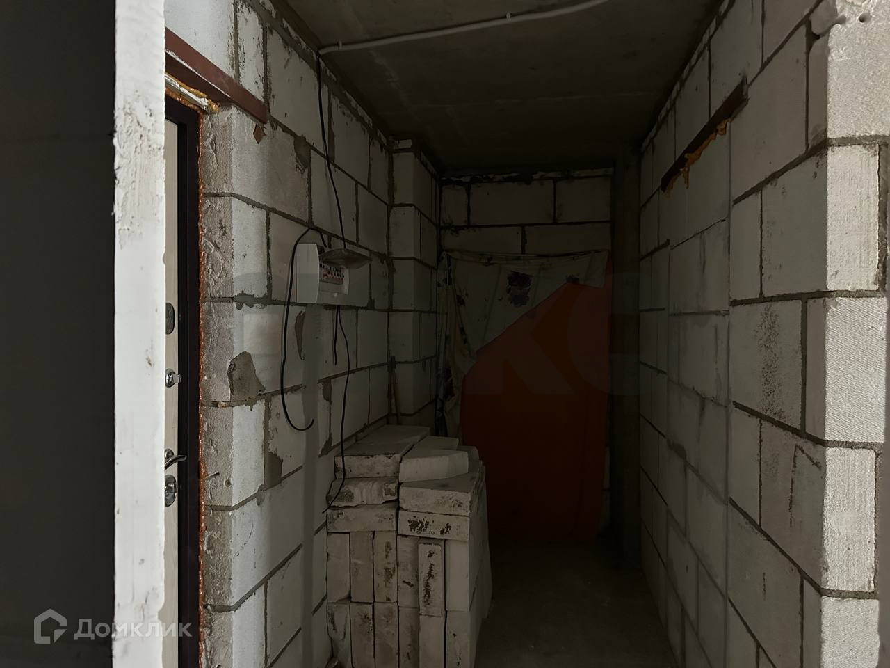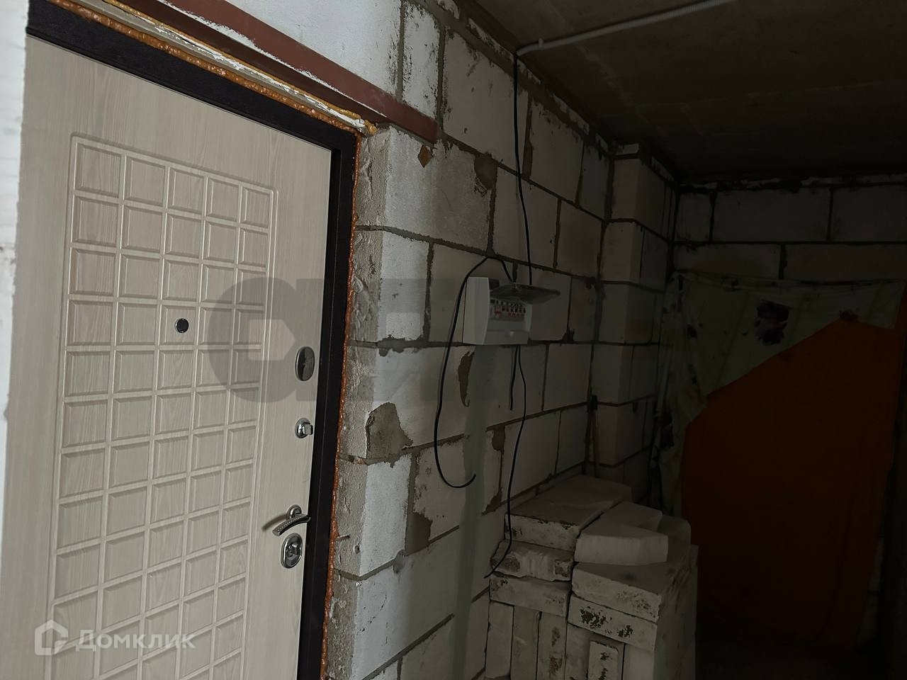 Ровная стяжка пола, хорошая входная дверь. Частично разведена электрика.