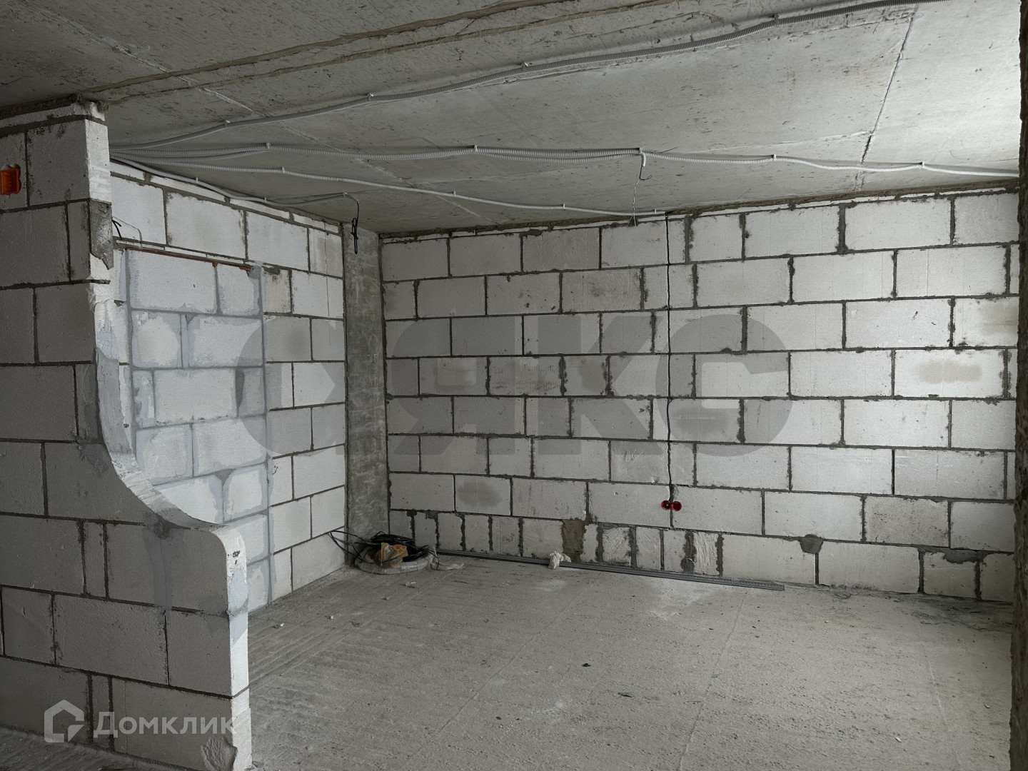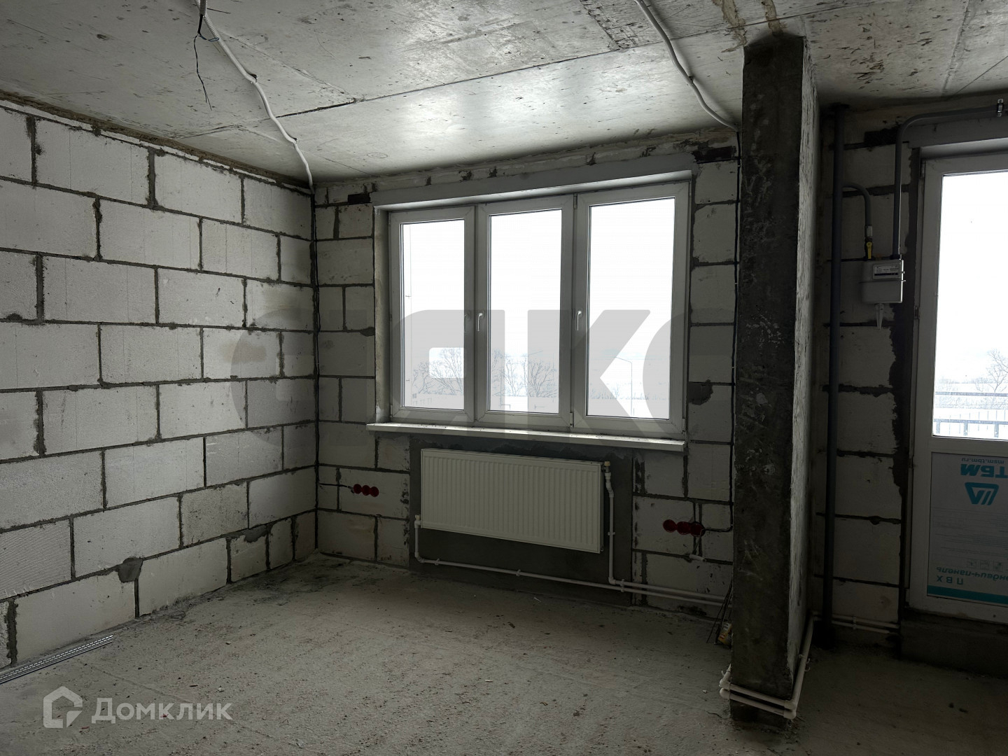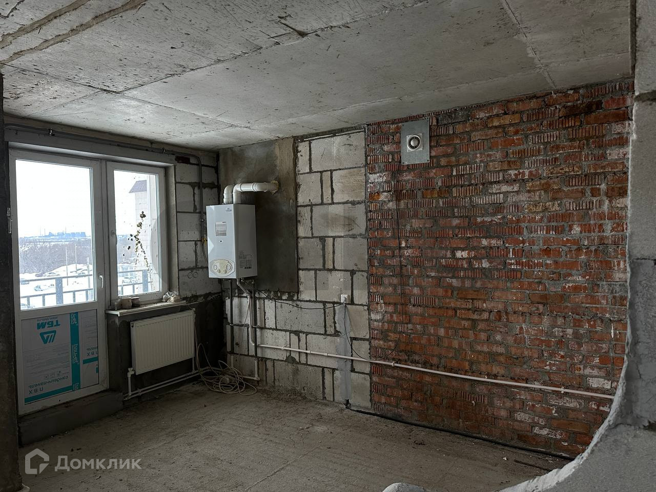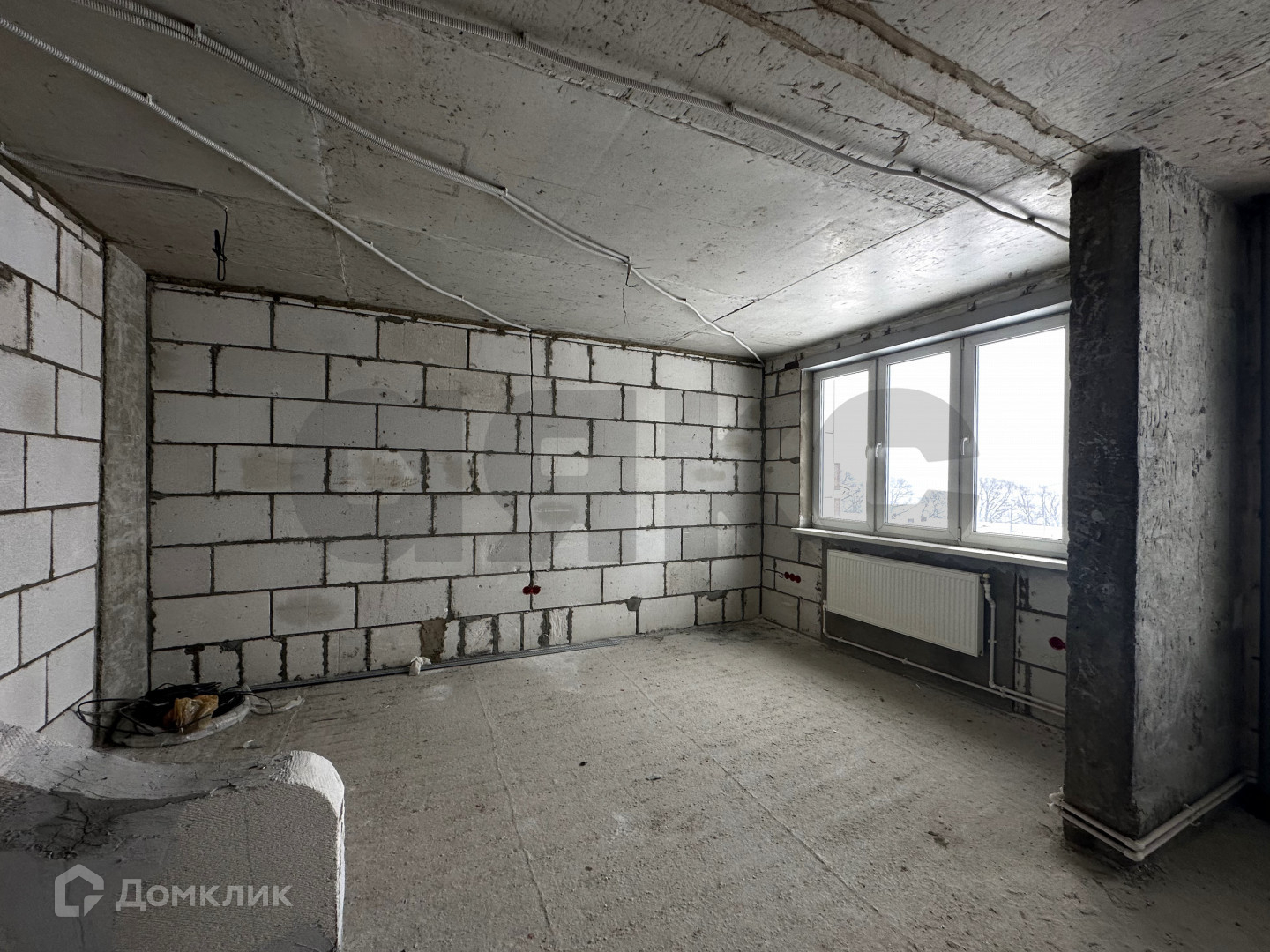 Ровная стяжка пола, хорошая входная дверь. Частично разведена электрика.