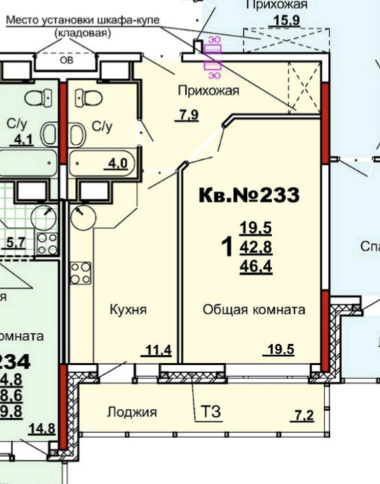 Общая площадь 46.3 м2