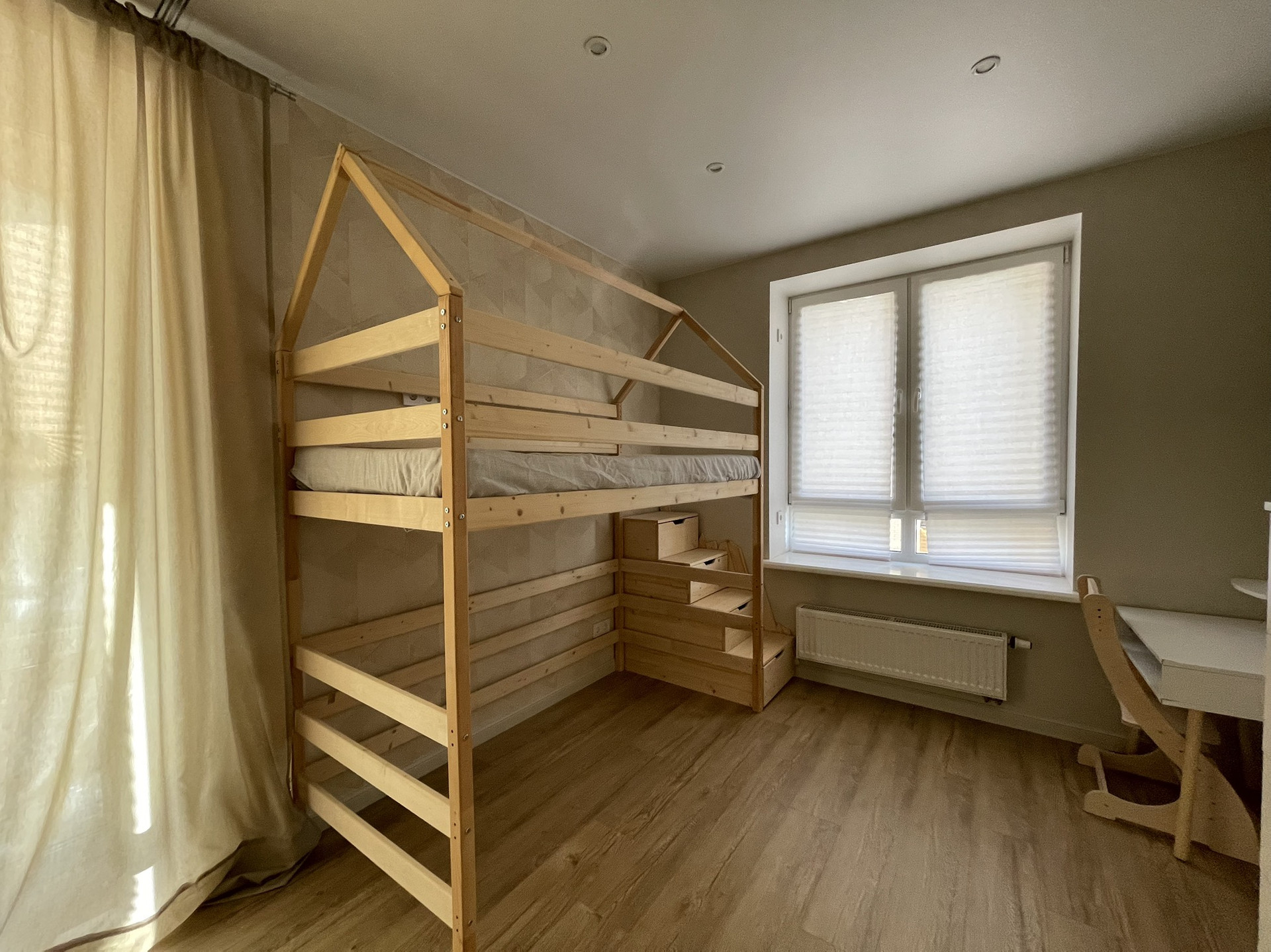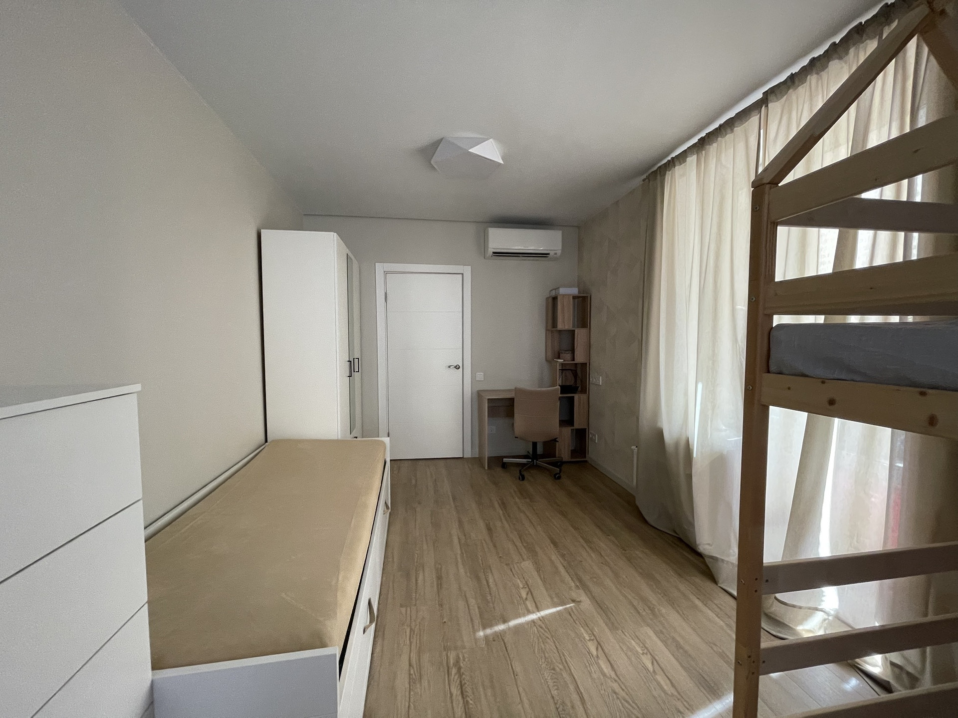 В комнате сделана звукоизоляция потолка. Оснащена необходимой мебелью, которая останется при продаже. Дополнительных вложений не требует.