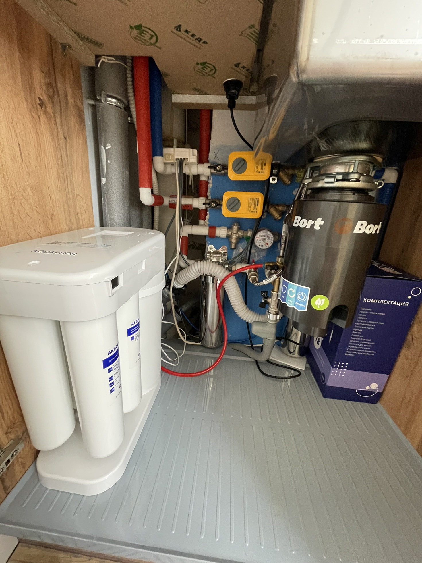 В санузле и на кухне установлена защита от протечек. На кухне фильтр для питьевой воды(нет нужны в покупке питьевой и хранении бутылок), измельчитель бытовых отдохов.