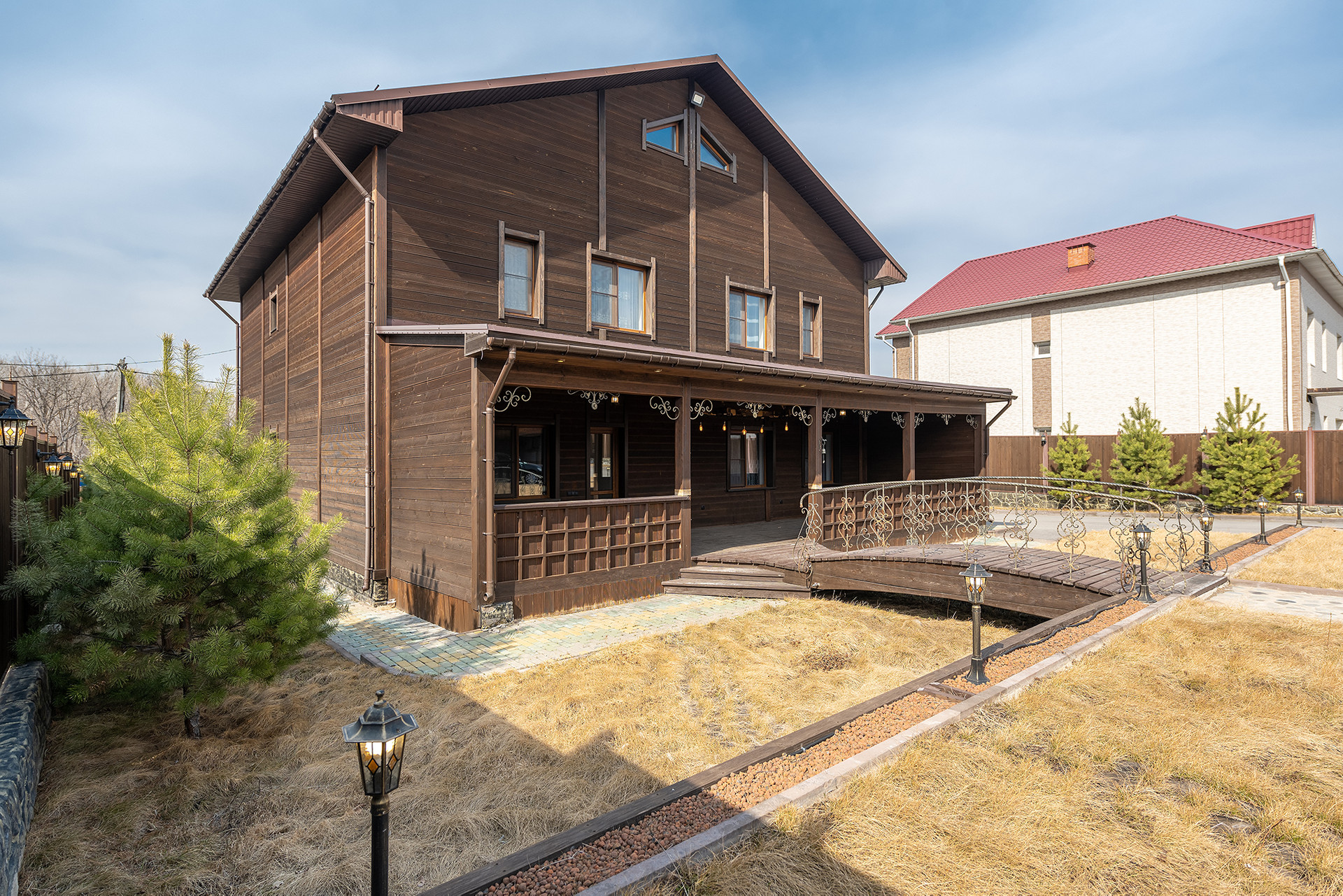 Коттедж 2020 года, площадь дома 311 кв.м, материал стен кедровый брус 200*200, фасад - лиственница, фундамент - сваи.