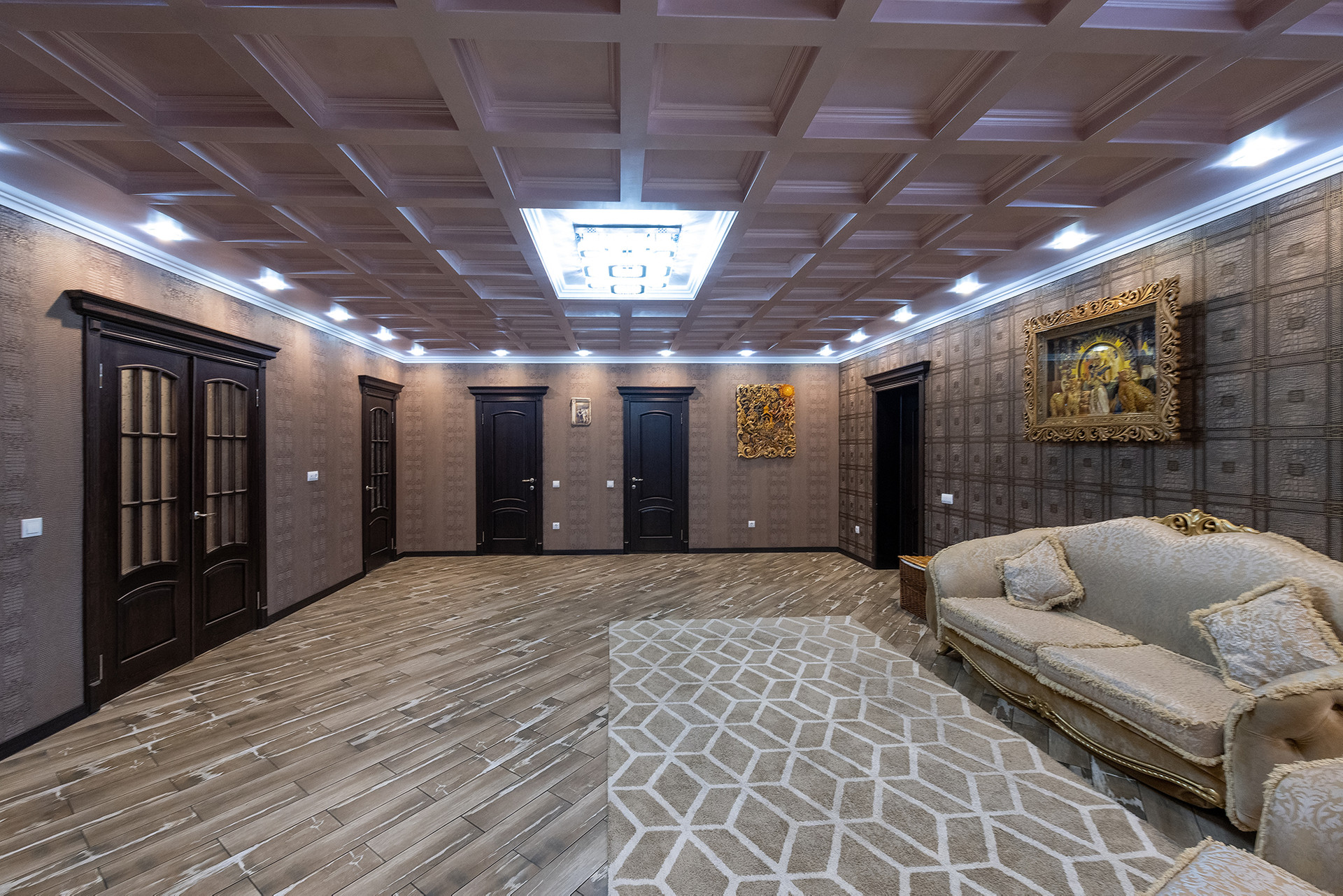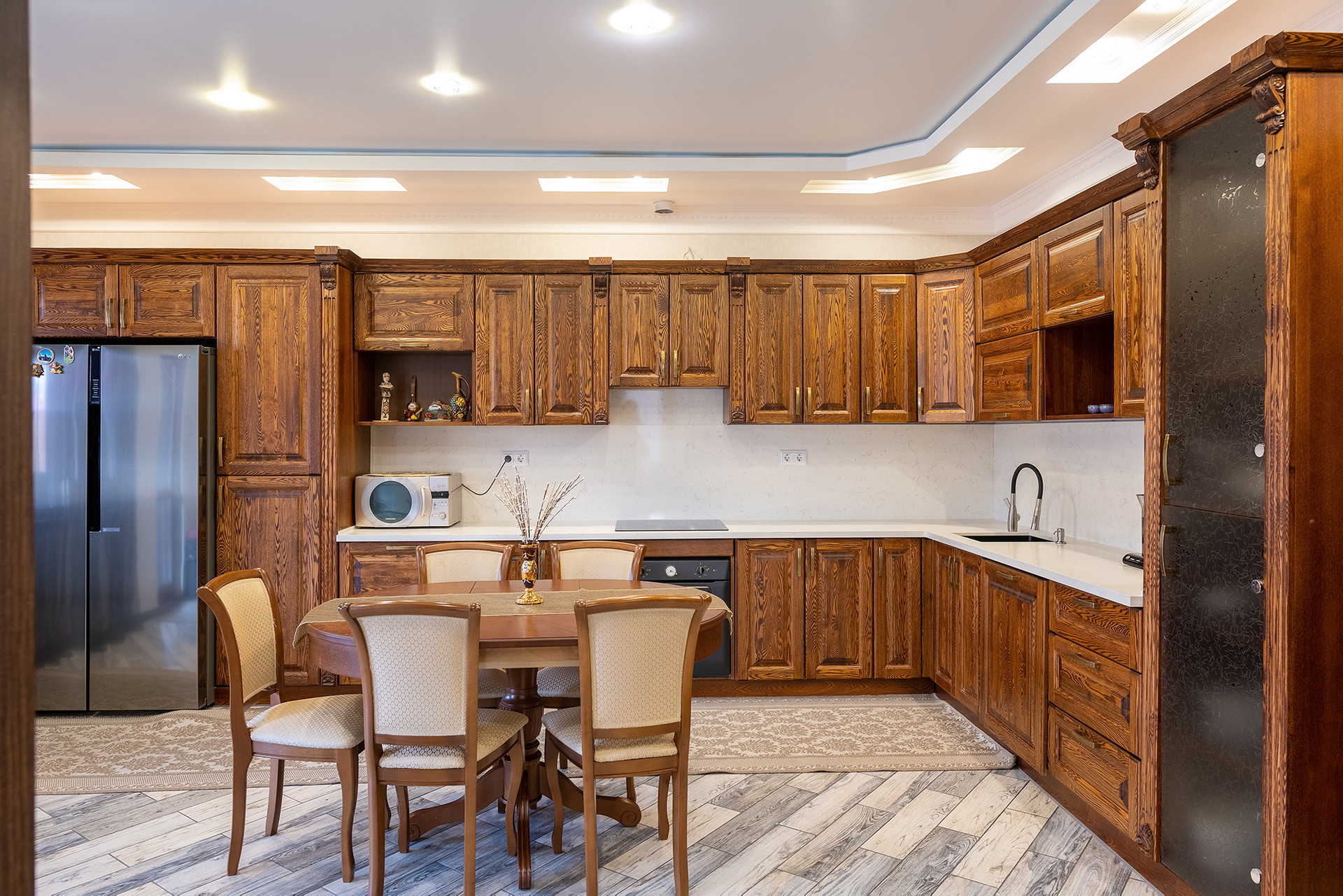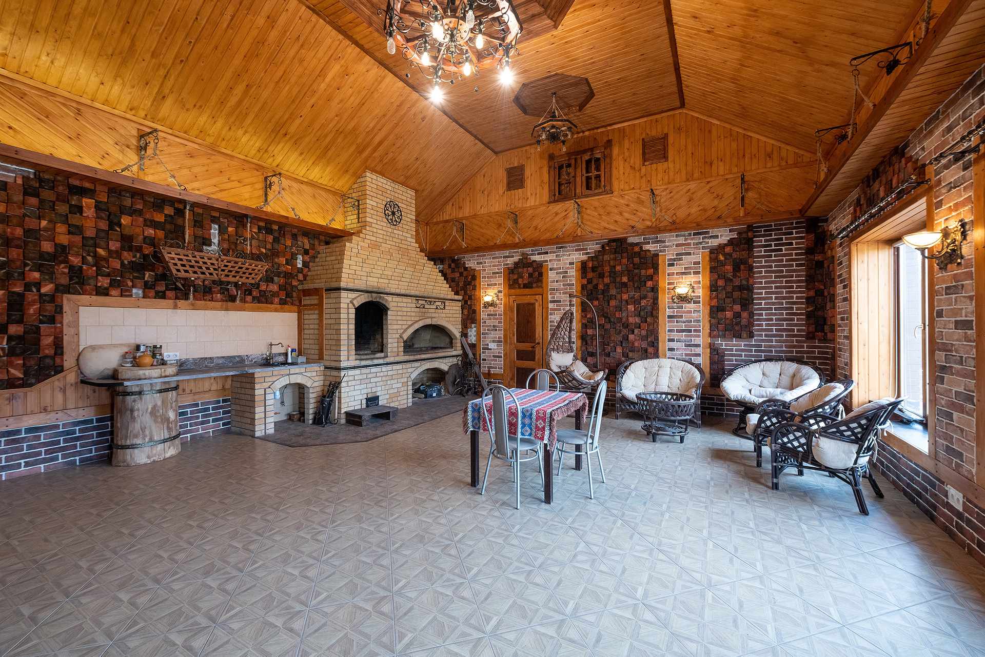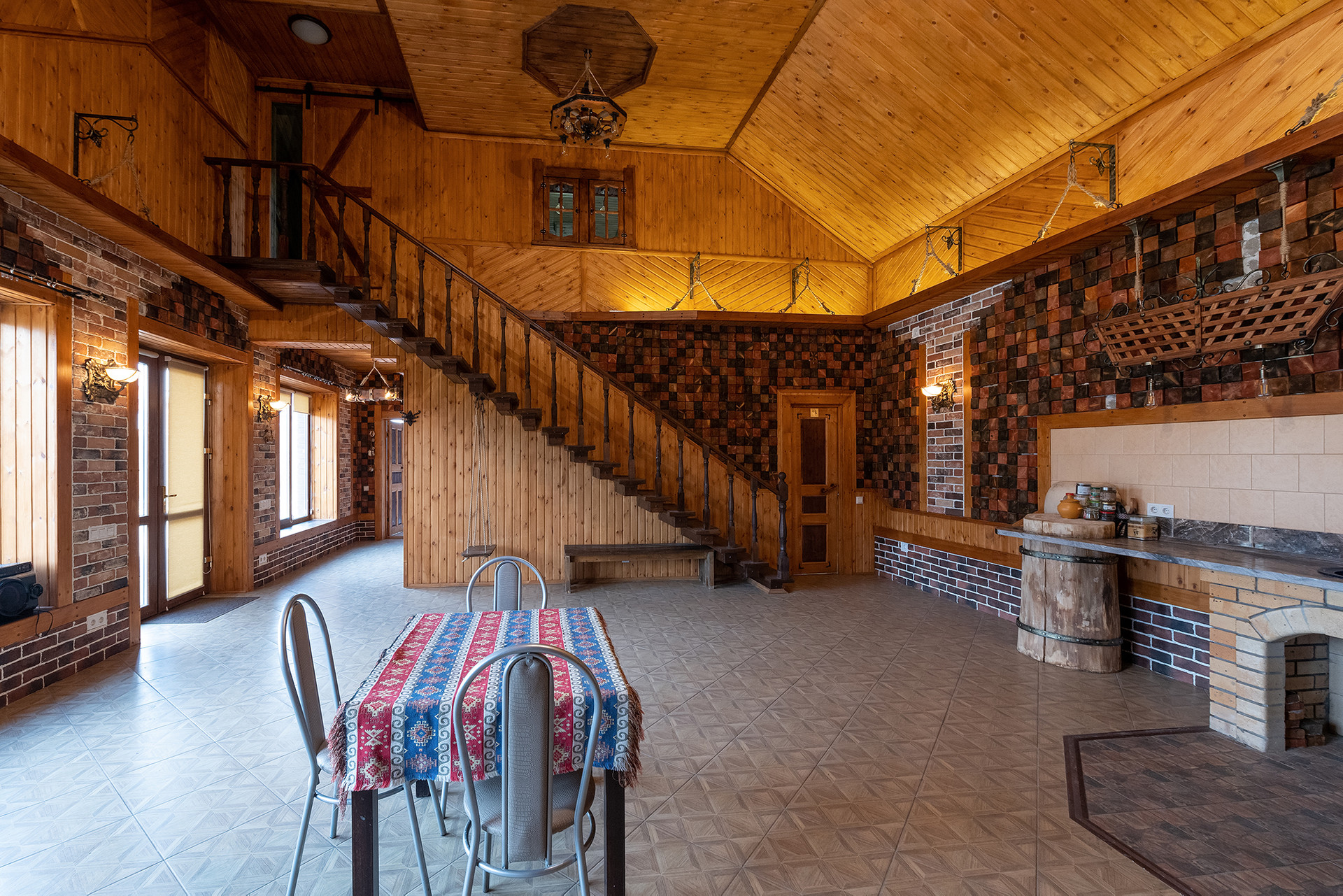 Ремонт выполнен в благородных цветовых гаммах, с использованием натуральных материалов: дерево, камень, керамогранит. Дом полностью укомплектован дорогой мебелью и бытовой техникой, создавали красоту для себя. Дом очень атмосферный уютный и теплый.