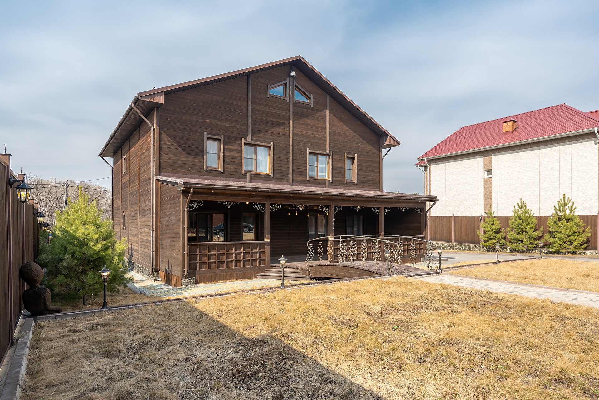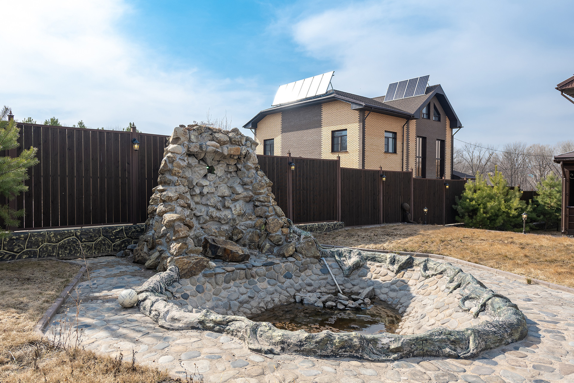 Площадь земельного участка 15 соток, ИЖС на территории есть искусственный водопад, территория асфальтирована и облагорожена газоном, по периметру территория ограждена декоративным забором.