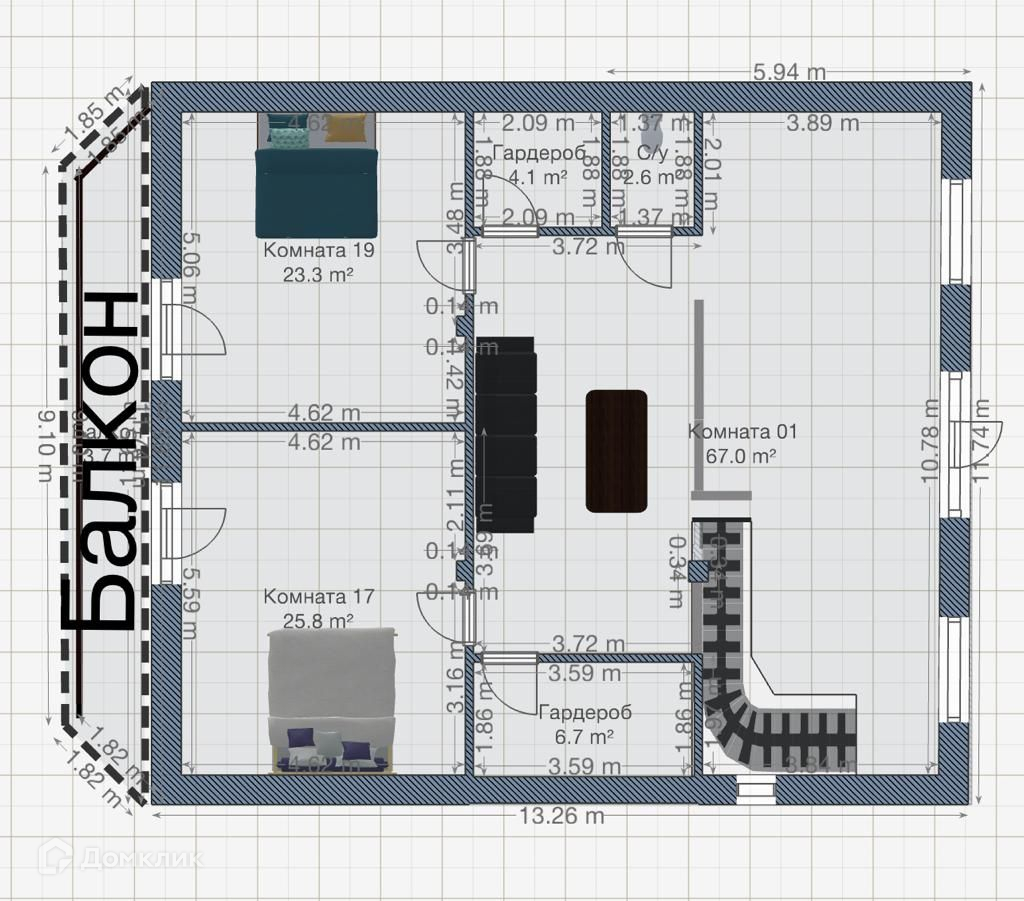 2 этаж: комната 25,8 м2, комната 23,3 м2, с/у, две гардеробные, холл, балкон с выходом из двух спален