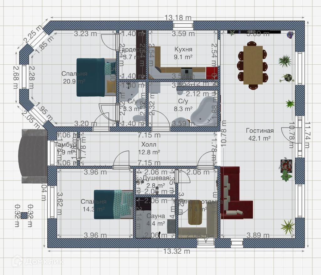 1 этаж: огромная зал-гостиная площадью 42,1 м2, спальня-20,9 м2 + гардеробная и с/у, спальня -14,3 м2, сауна +душ+раздевалка, с/у гостевой, холл