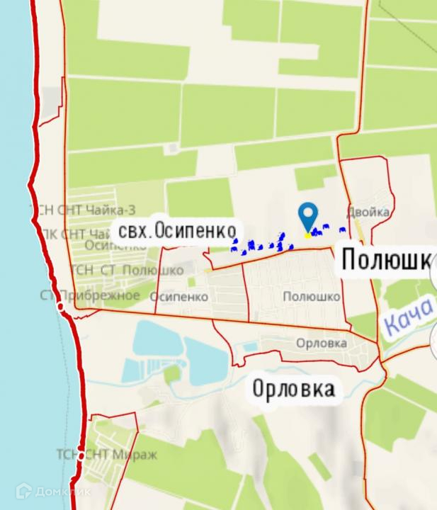 Участок находится в массиве жилой застройки с удобным подъездом, съезд с Качинского шоссе – 600 метров от дороги, остановки общественного транспорта и магазинов. И всего в 2,5 км от оборудованного пляжа «Звездный берег».