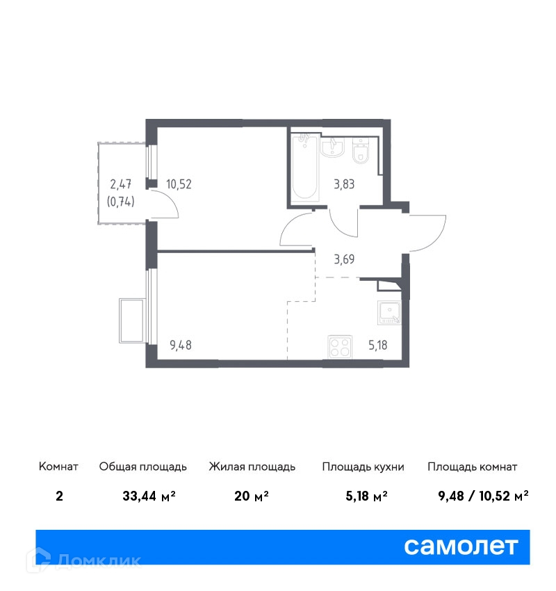 Общая площадь 33.44 м2