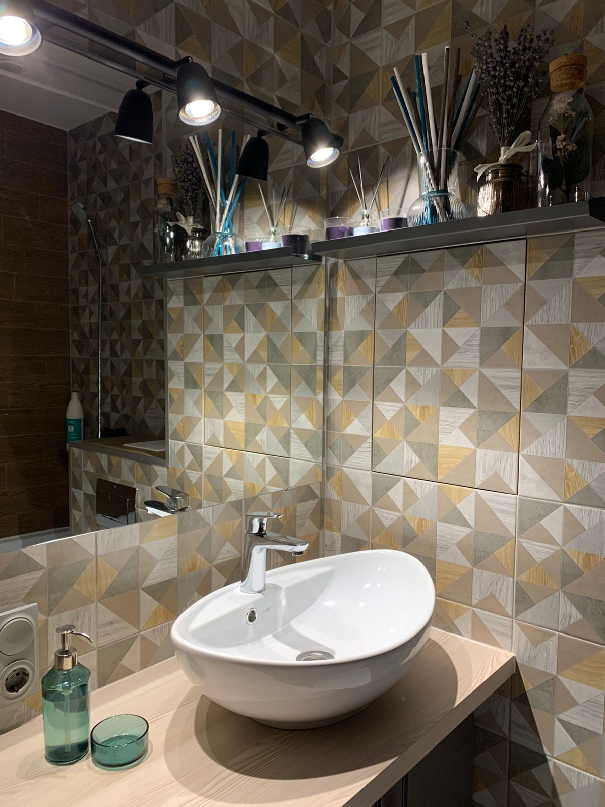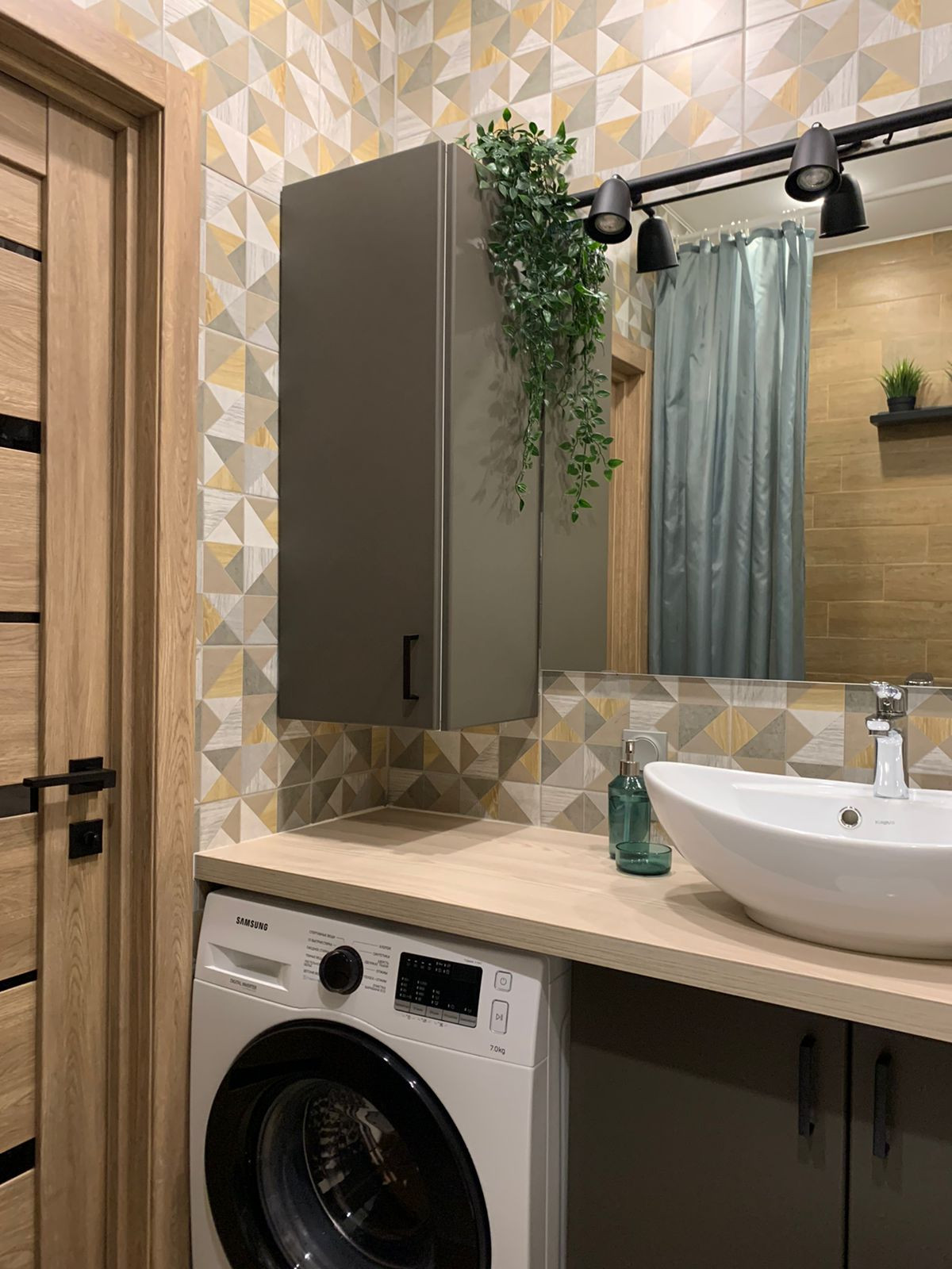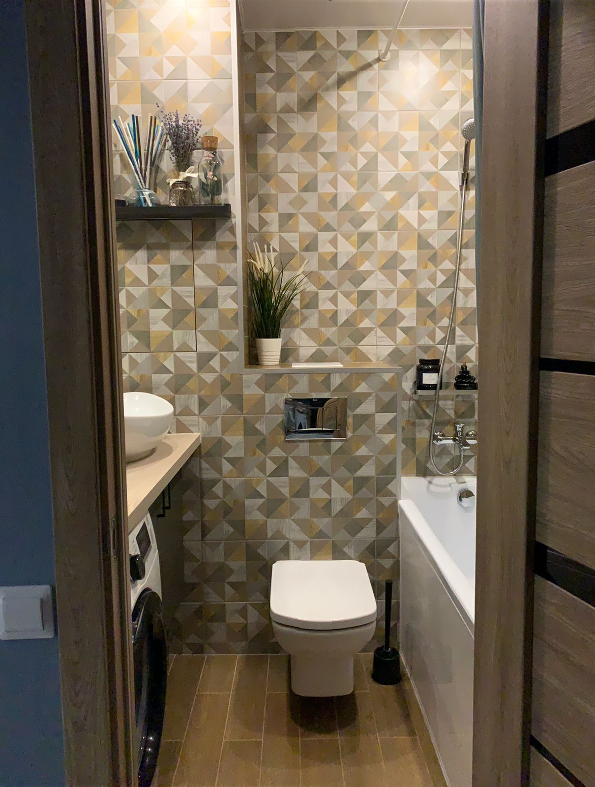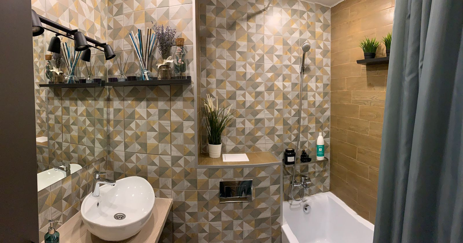 Выполнен авторский ремонт ванной комнаты с использованием композиции контрастных видов плитки, мебелью по индивидуальному заказу с накладной раковиной (остается покупателю). Установлена акриловая ванна и инсталляция унитаза фирмы  Roca.