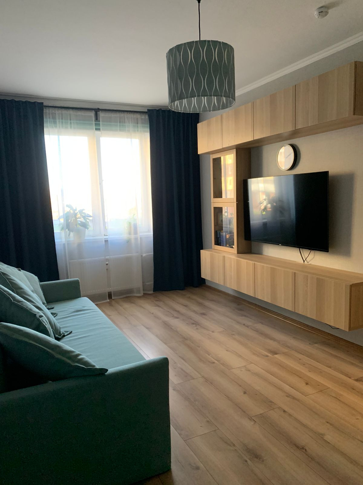 В гостиной заменён ламинат, переклеены обои.