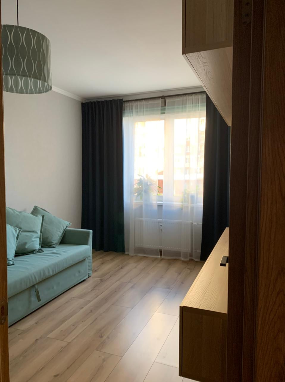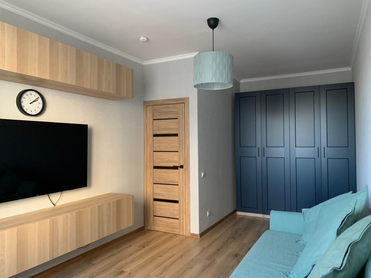 В гостиной заменён ламинат, переклеены обои.