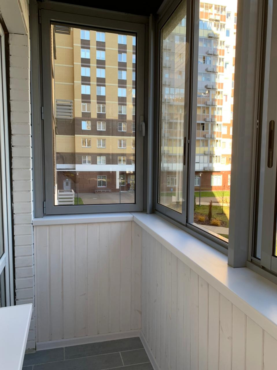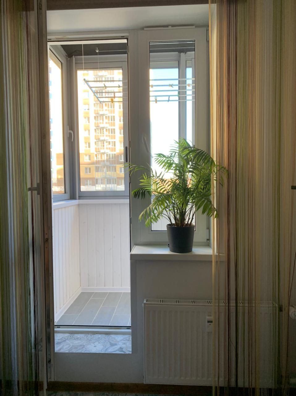 На лоджии выровнен пол по уровню дверного порога. Произведена обшивка деревянной вагонкой под подкраску, установлены подоконники, на полу керамогранит. По индивидуальному заказу выполнена регулируемая сушилка для белья, во всю длину лоджии.