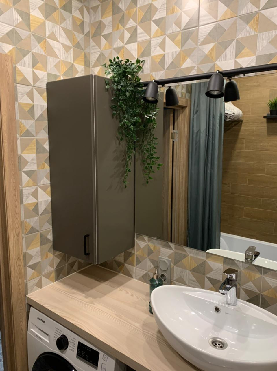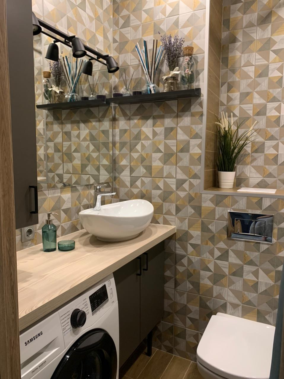 Выполнен авторский ремонт ванной комнаты с использованием композиции контрастных видов плитки, мебелью по индивидуальному заказу с накладной раковиной (остается покупателю). Установлена акриловая ванна и инсталляция унитаза фирмы  Roca.